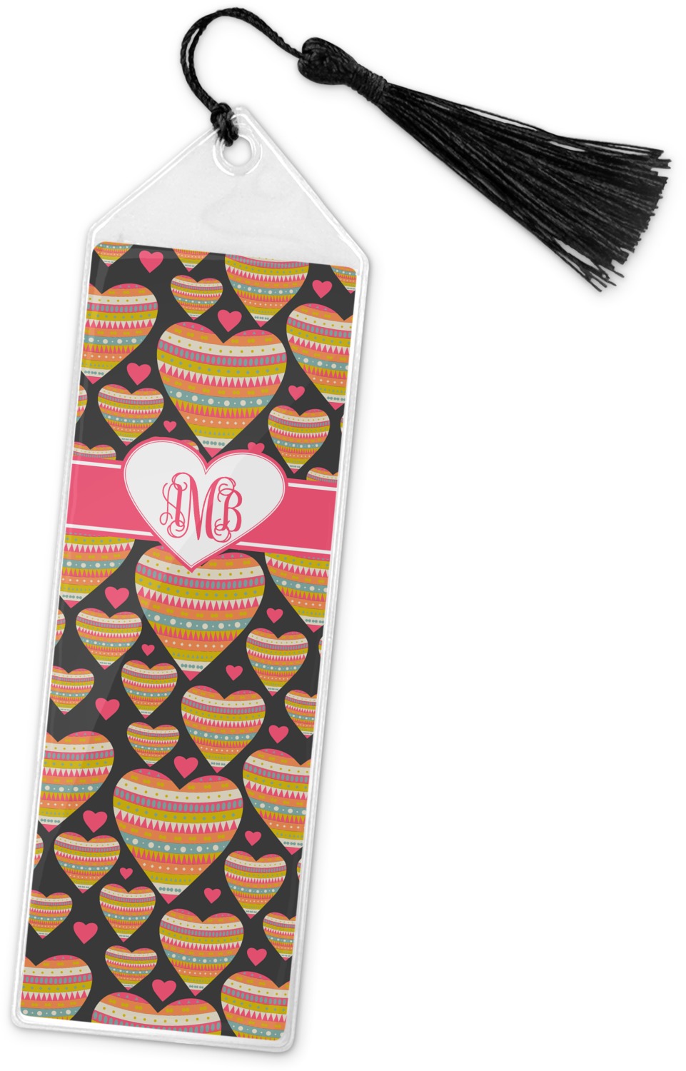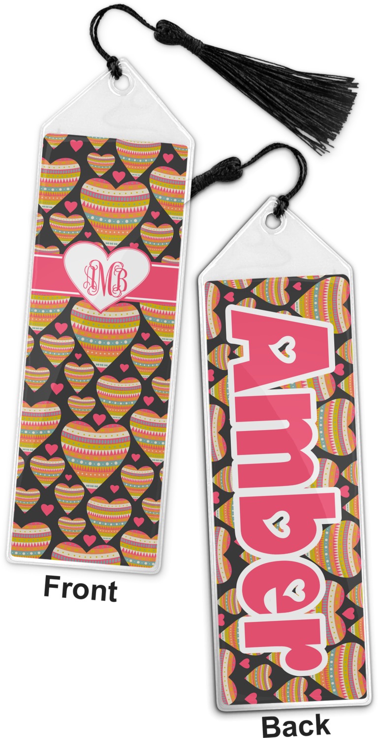 Your personalized bookmark is made of a sturdy, clear vinyl, and is approximately 7.5" x 2.25". We display your personalization on vinyl inserts that are placed on both sides. Accompanying each book marker is a black, fringe tassel that attaches to the reinforced, triangular header.