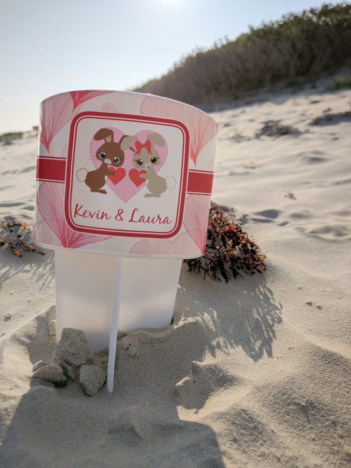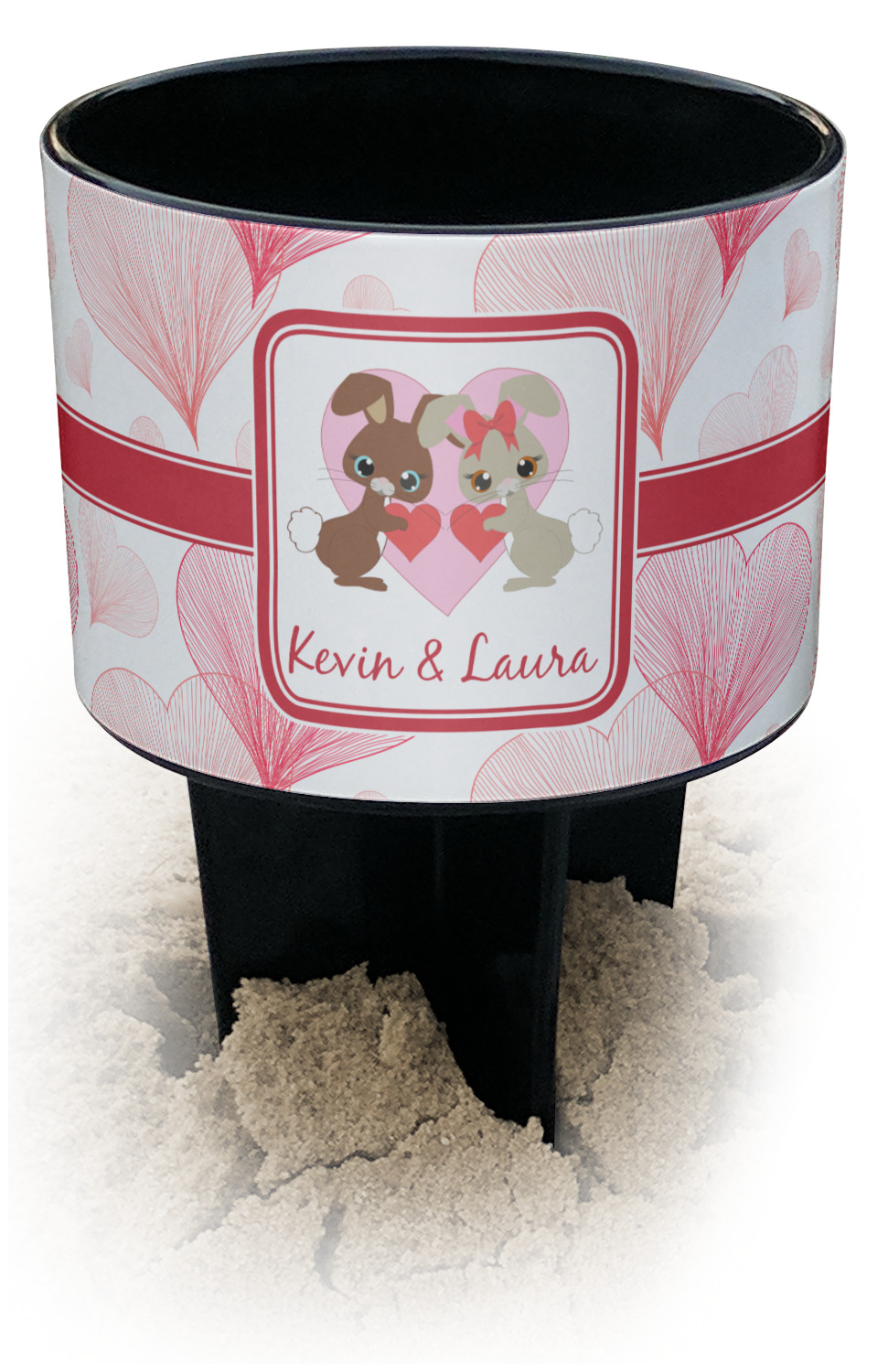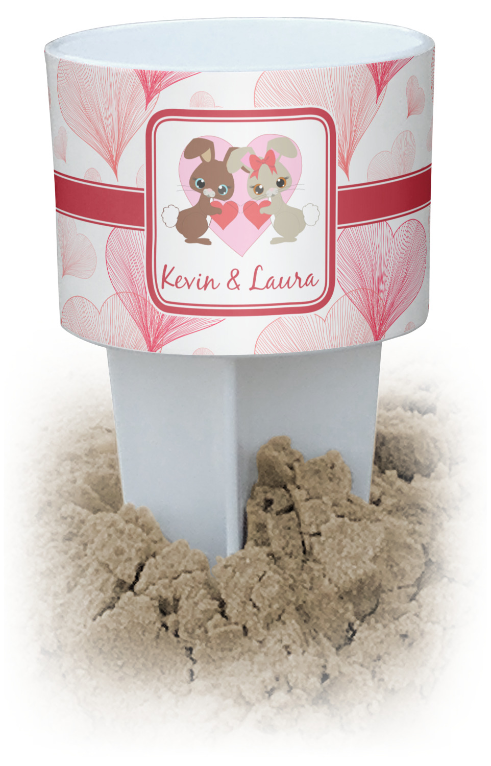This cup holder has a large stake at its bottom that anchors it to the sand or ground below, while the cup holder rests above the stake. The entire drink holder is made of durable plastic and displays your customization around the cup holder portion. We sell these personalized beach spikers in two different colors: black and white.