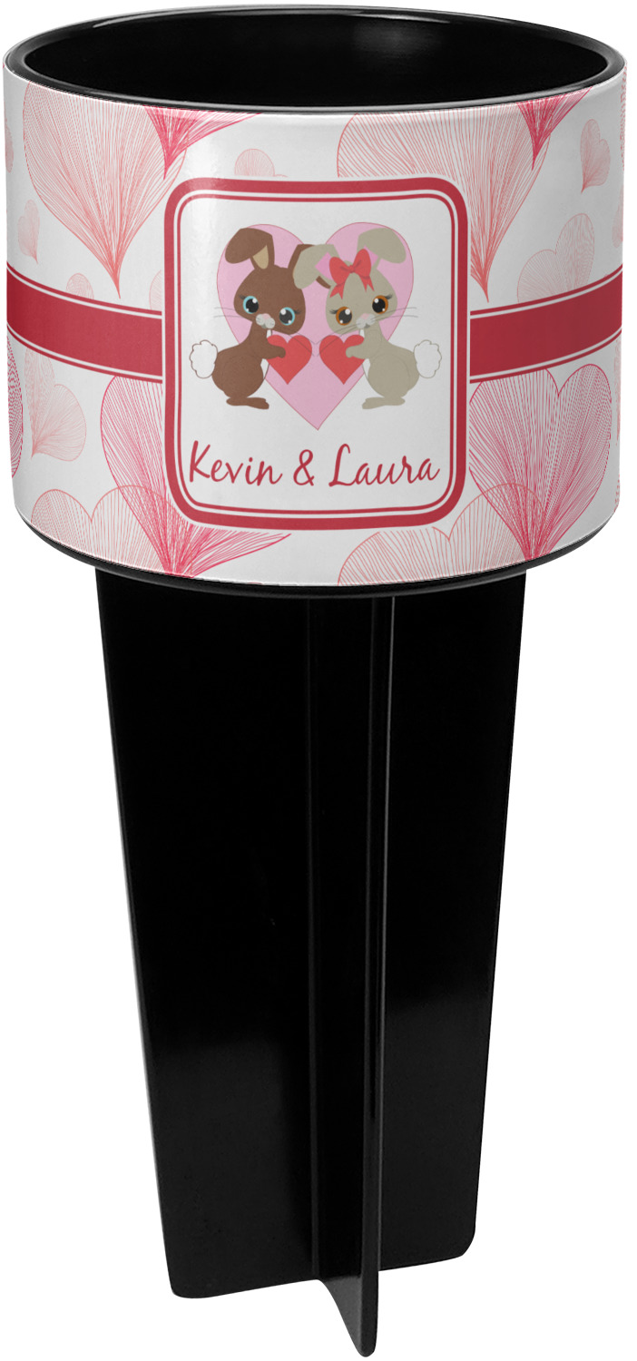 This cup holder has a large stake at its bottom that anchors it to the sand or ground below, while the cup holder rests above the stake. The entire drink holder is made of durable plastic and displays your customization around the cup holder portion. We sell these personalized beach spikers in two different colors: black and white.