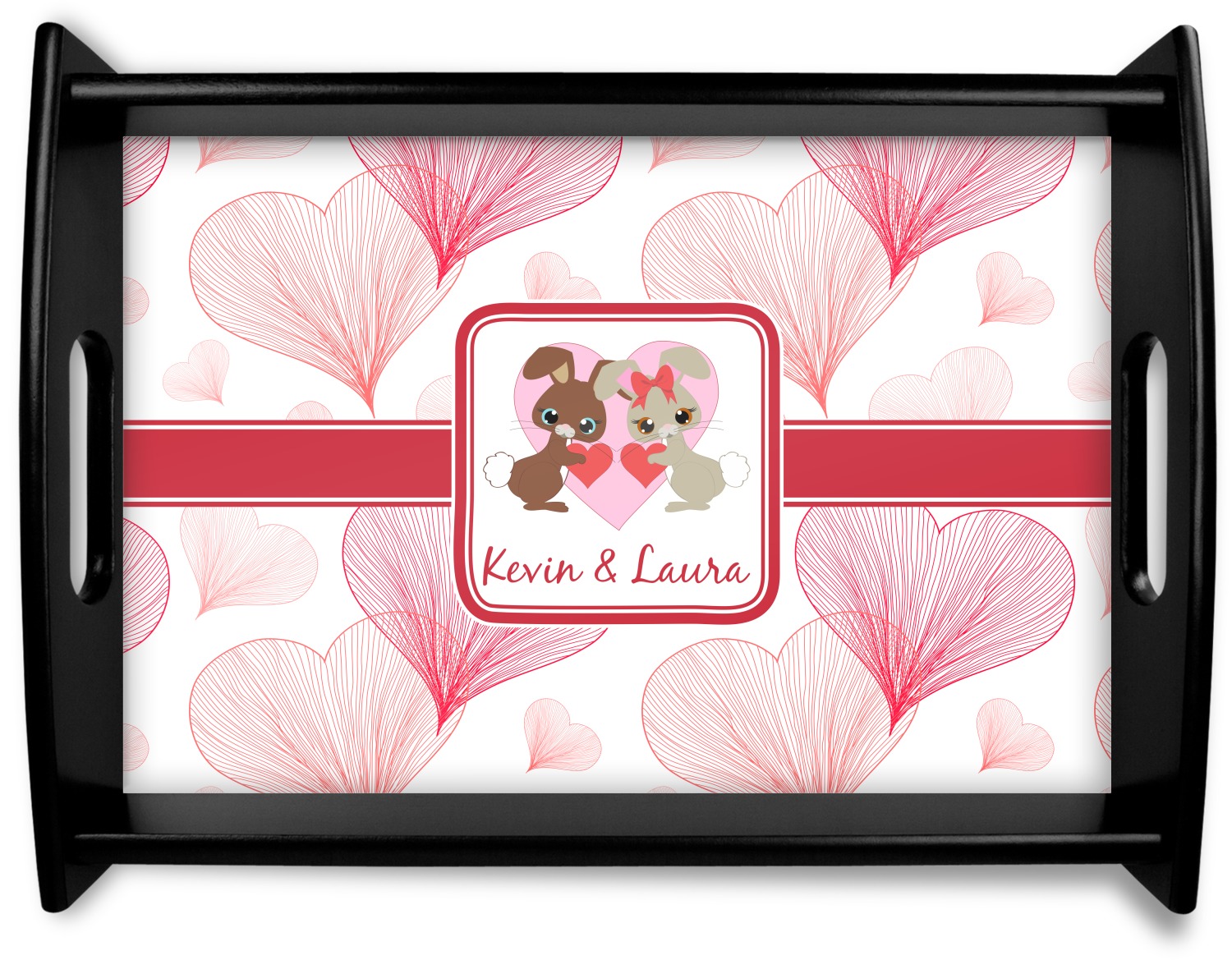 This serving tray with handles features square edges and two rounded sides, creating a very modern look. Each side is fabricated from a beautifully cut, natural wood. The bottom of the interior of the tray displays your customized design in bright, vibrant color. The tray is sold in both a black color and a natural wood look. Each variation of the wood serving tray has two sizes: Small, which is 14" x 10" x 2.25", and Large, which is 19.5" x 13.5" x 2.75".