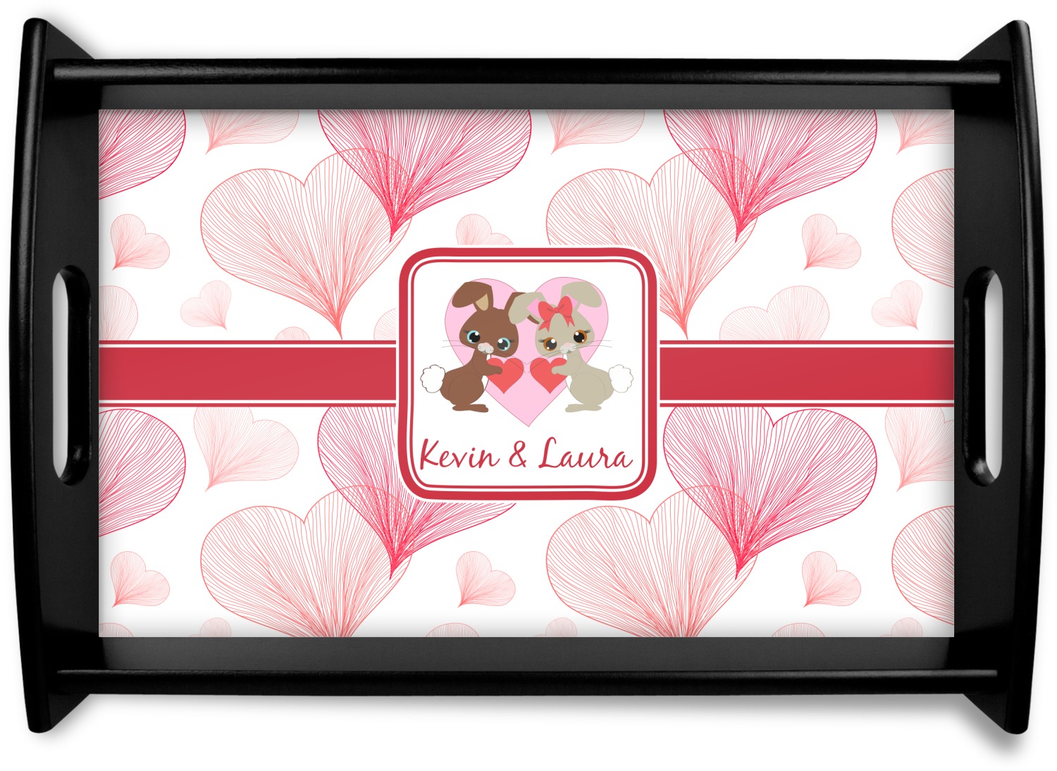 This serving tray with handles features square edges and two rounded sides, creating a very modern look. Each side is fabricated from a beautifully cut, natural wood. The bottom of the interior of the tray displays your customized design in bright, vibrant color. The tray is sold in both a black color and a natural wood look. Each variation of the wood serving tray has two sizes: Small, which is 14" x 10" x 2.25", and Large, which is 19.5" x 13.5" x 2.75".