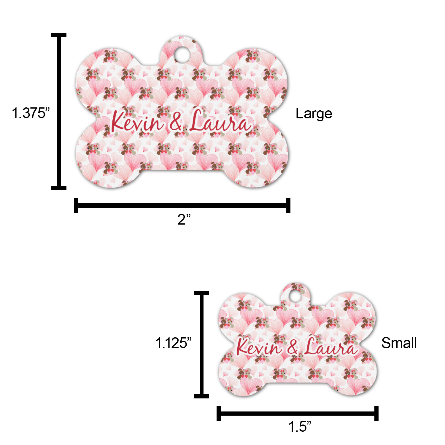 The small bone dog tag size is perfect to pair with our small dog collars, the large size pairs well with our large dog collars.