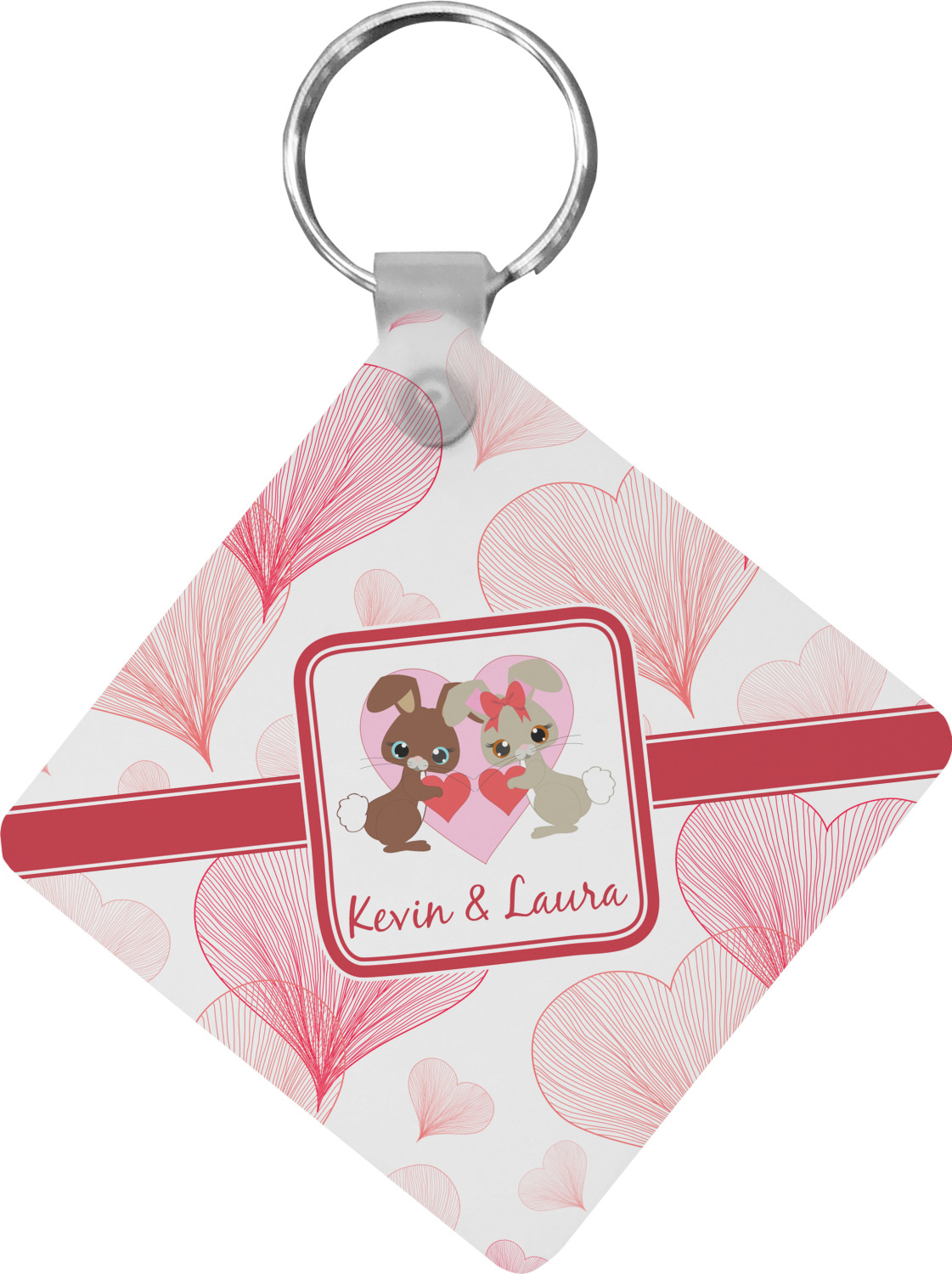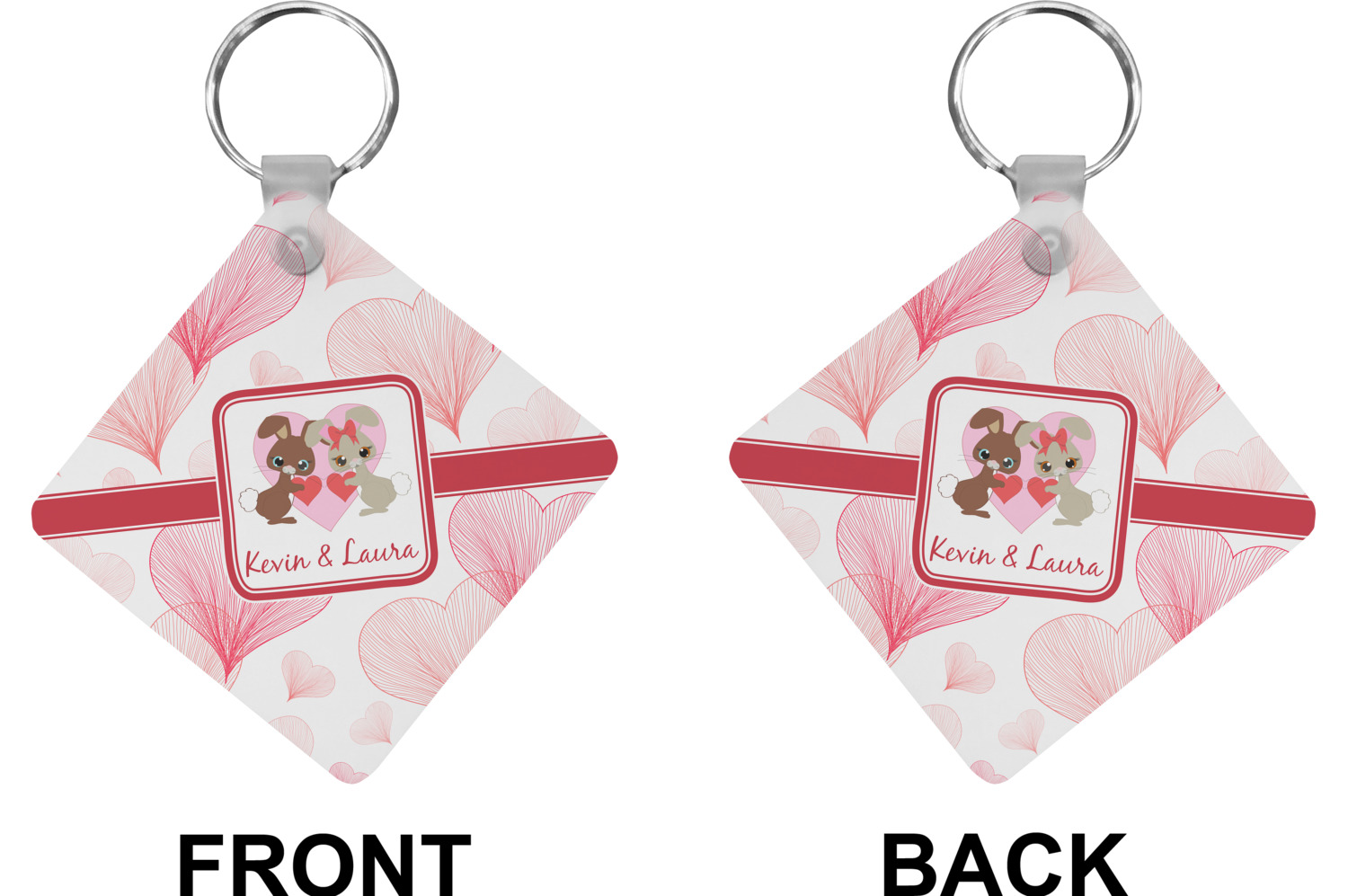 Our personalized keychains attach to the included metal, split key ring with a plastic, removable snap. Since a metal ring is included with your purchase, you have the liberty to keep your keys together on the ring, with or without your unique keychain. We offer this keychain in three different shapes: circle, heart, or diamond. We print your personalized design(s) on both sides of the key chain, and the surface has a glossy, reflective finish that only emphasizes your design. Each keychain is approximately 2.25 by 2.25 inches.