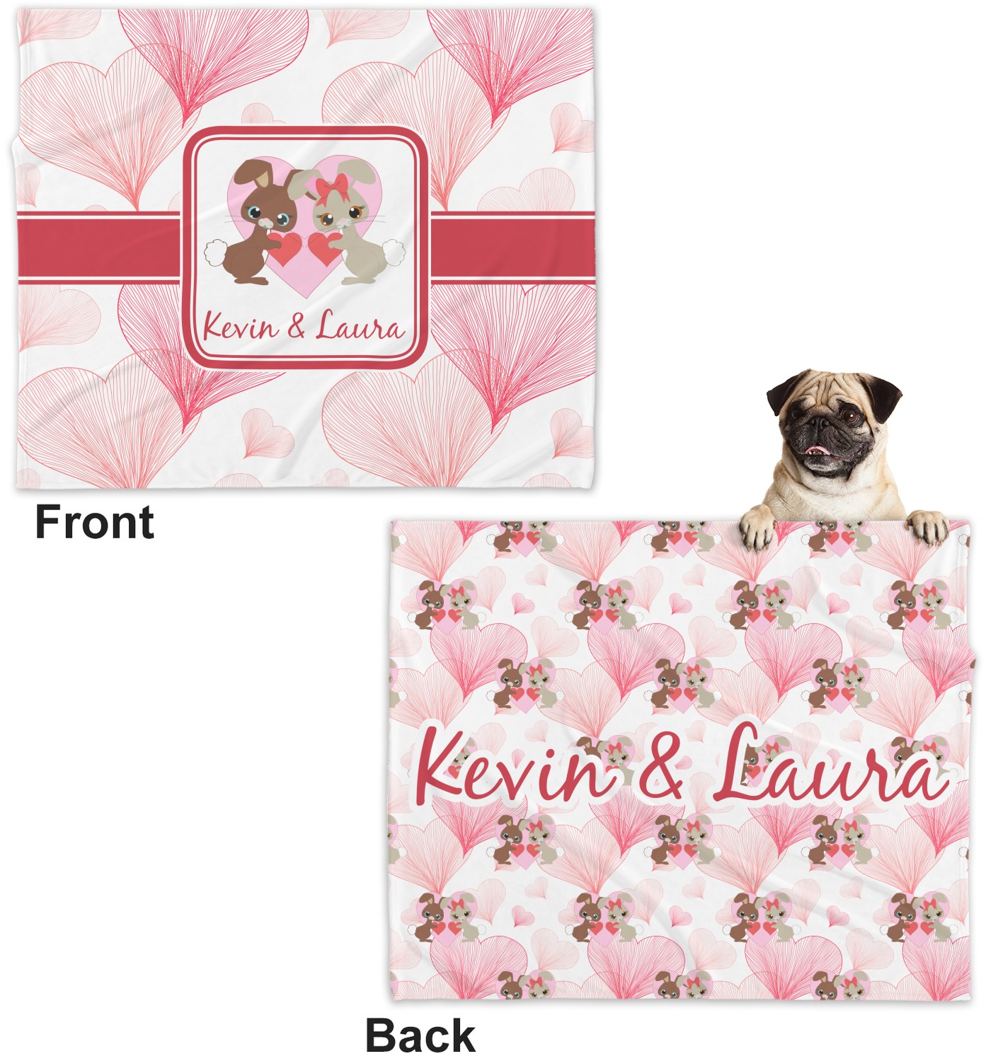These dog blankets are crafted from a gentle, soft-to-the-touch, minky material. We print your customizations, either matching or differing, on both the top and underside of the blanket. These personalized dog blankets are available in two sizes: regular and large. Our regular size, at 40" x 30", accommodates small and some medium size dogs. At 60" x 50", our large dog blanket is a better fit for bigger breeds. Though specialized for dogs, these blankets still make a thoughtful gift for your favorite feline, or any other pet in mind!