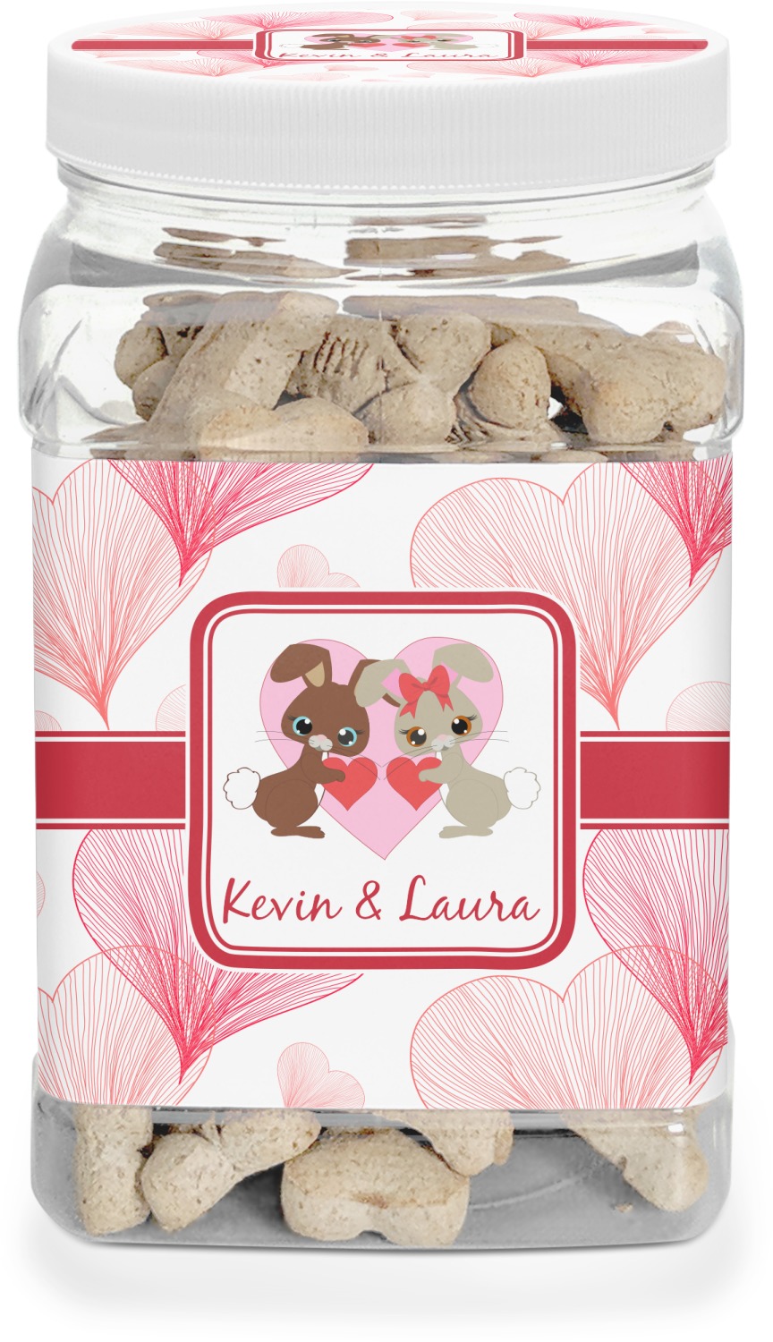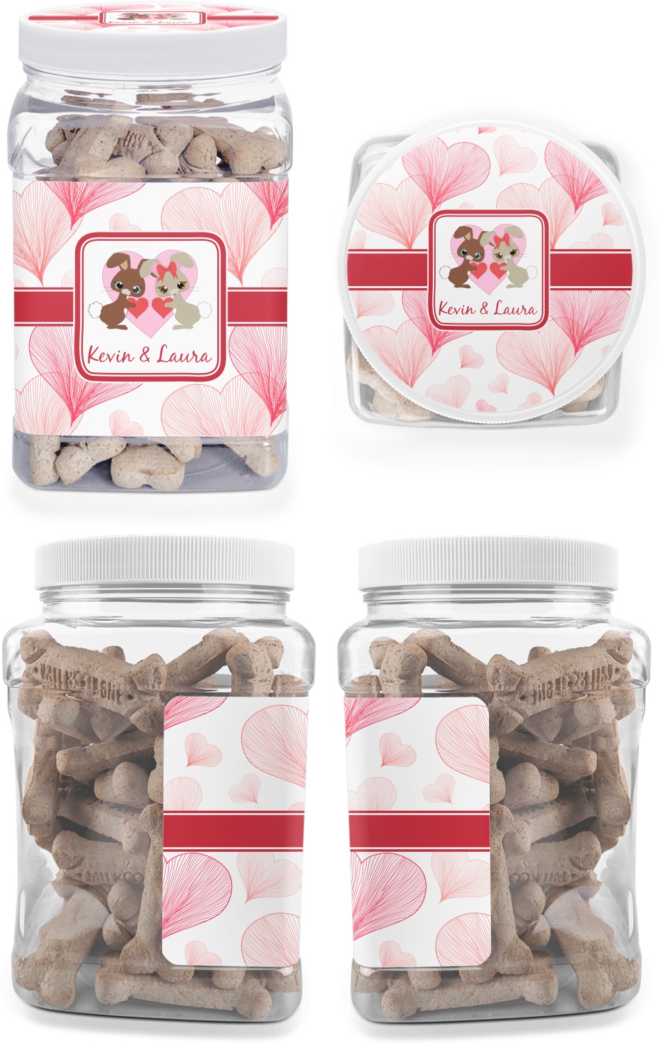 This half gallon jar, made from a sturdy plastic, is the perfect way to keep treats from any naughty pet paws, while still keeping them ready on hand for when your pup performs an impressive trick. This dog cookie jar features a screw-on, white lid that displays your personalized design on a vinyl sticker. We apply another customized sticker that wraps around the front and sides of the jar. Our dog treat jar also has indentations on the rear ends of the sides, which allows for convenient handling, and its square frame allows for easy storage.