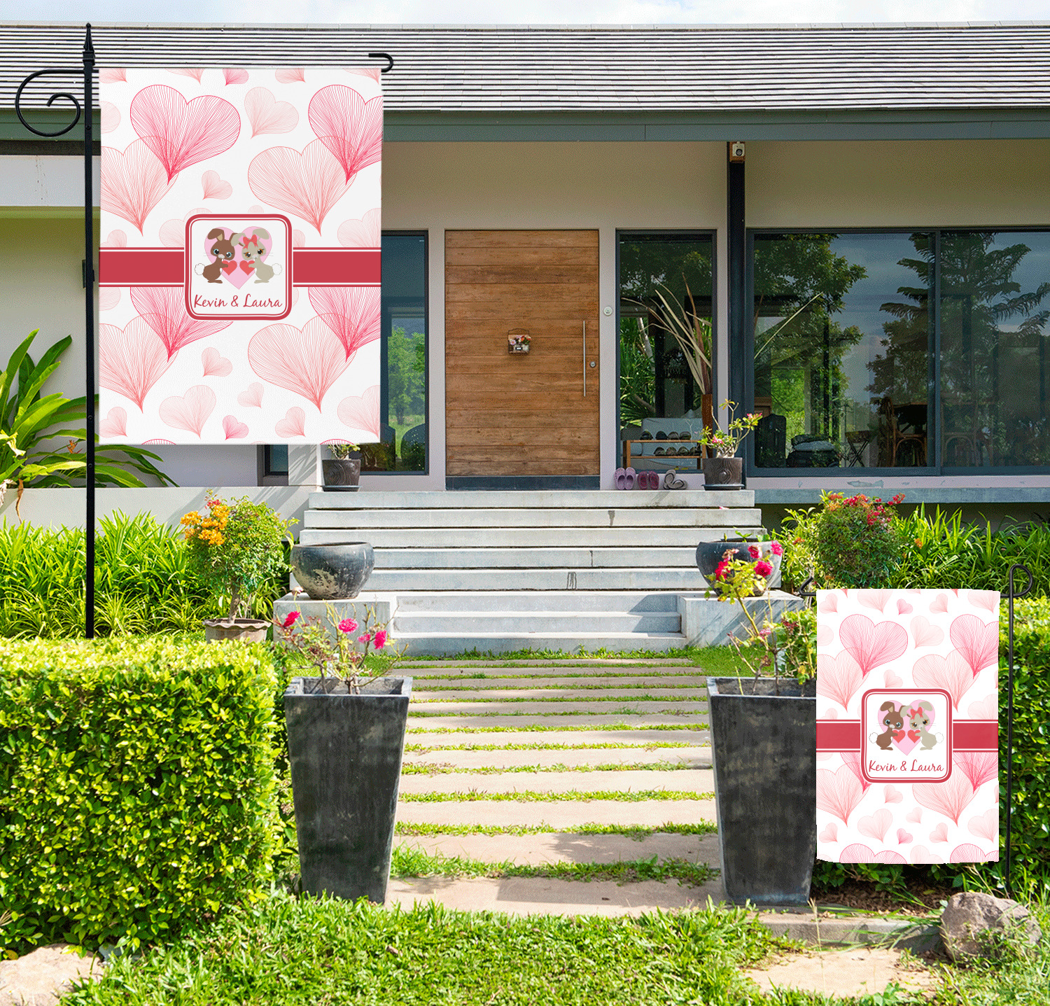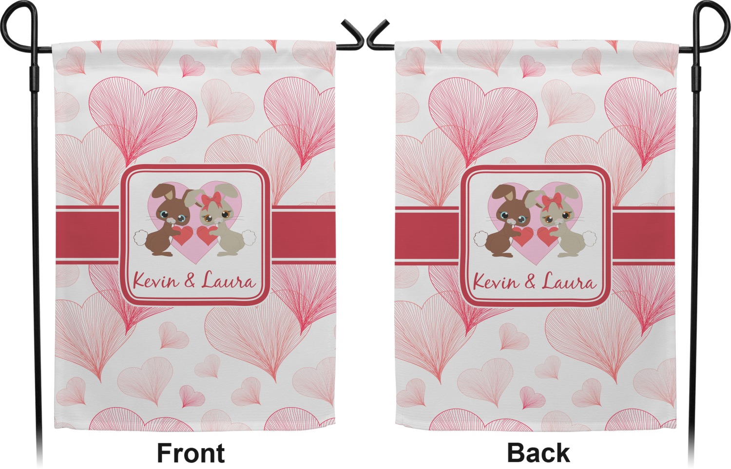 These custom garden flags are made of a durable, double-ply, polyester weave, allowing them to withstand the elements year round. The small flags measure at approximately 12 by 18 inches. The large flags measure out to 28 by 37 inches. You can order these decorative flags with your customization printed on the front only, or the front and back.