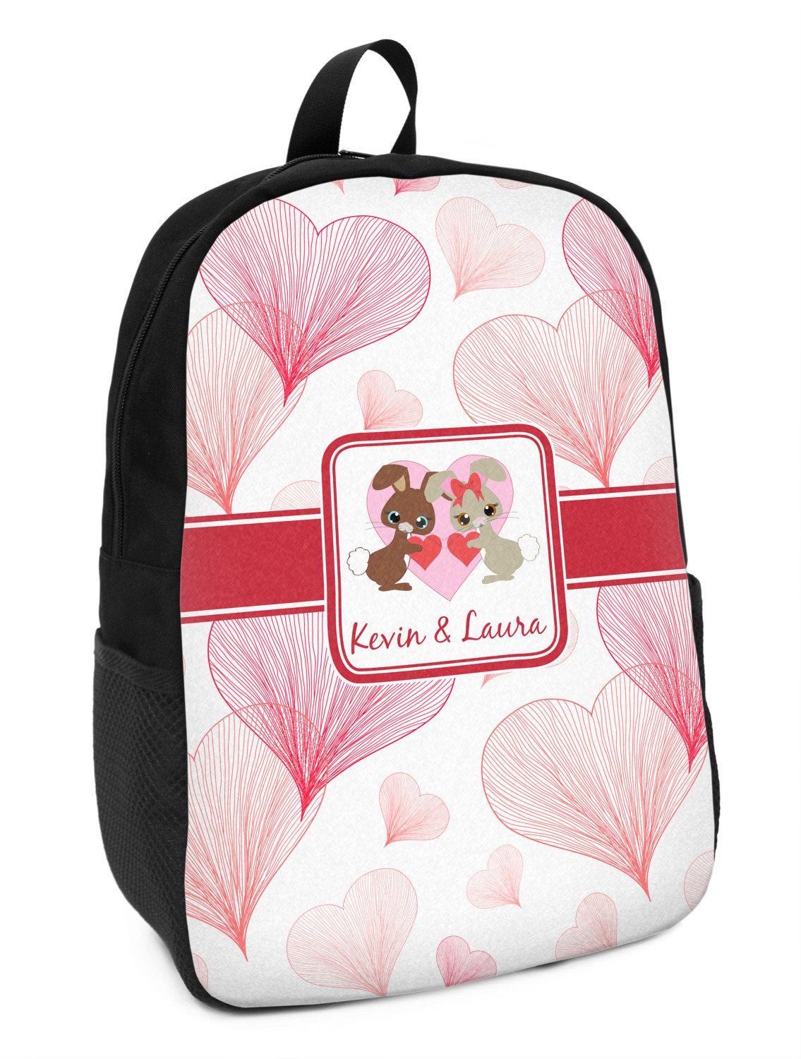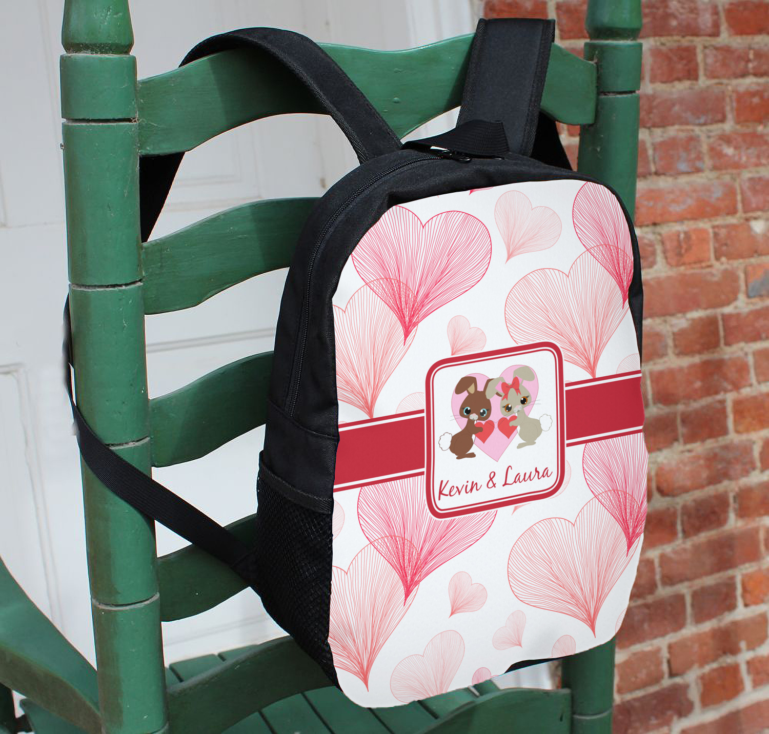 These small backpacks are made of a durable black canvas material with your personalization right on the front. The two shoulder straps are padded and easily adjustable. The bag itself measures at about 11" W x 15" H x 5" D. It's the perfect size for elementary aged kids or adults who want a smaller backpack. On the top of the bag you will find a handle to hang or carry your backpack by as well as a large zipper closure to keep all of your belongings safe inside. On each side of your backpack is a mesh pocket for a small item or water bottle. Inside your backpack you will find a spacious area with a small zipper pocket and a padded laptop slot that will fit up to a 13" laptop (13" being very snug). This is the perfect bag for any student that needs a couple books and their laptop with them at all times. It also works great as a carry on for traveling!