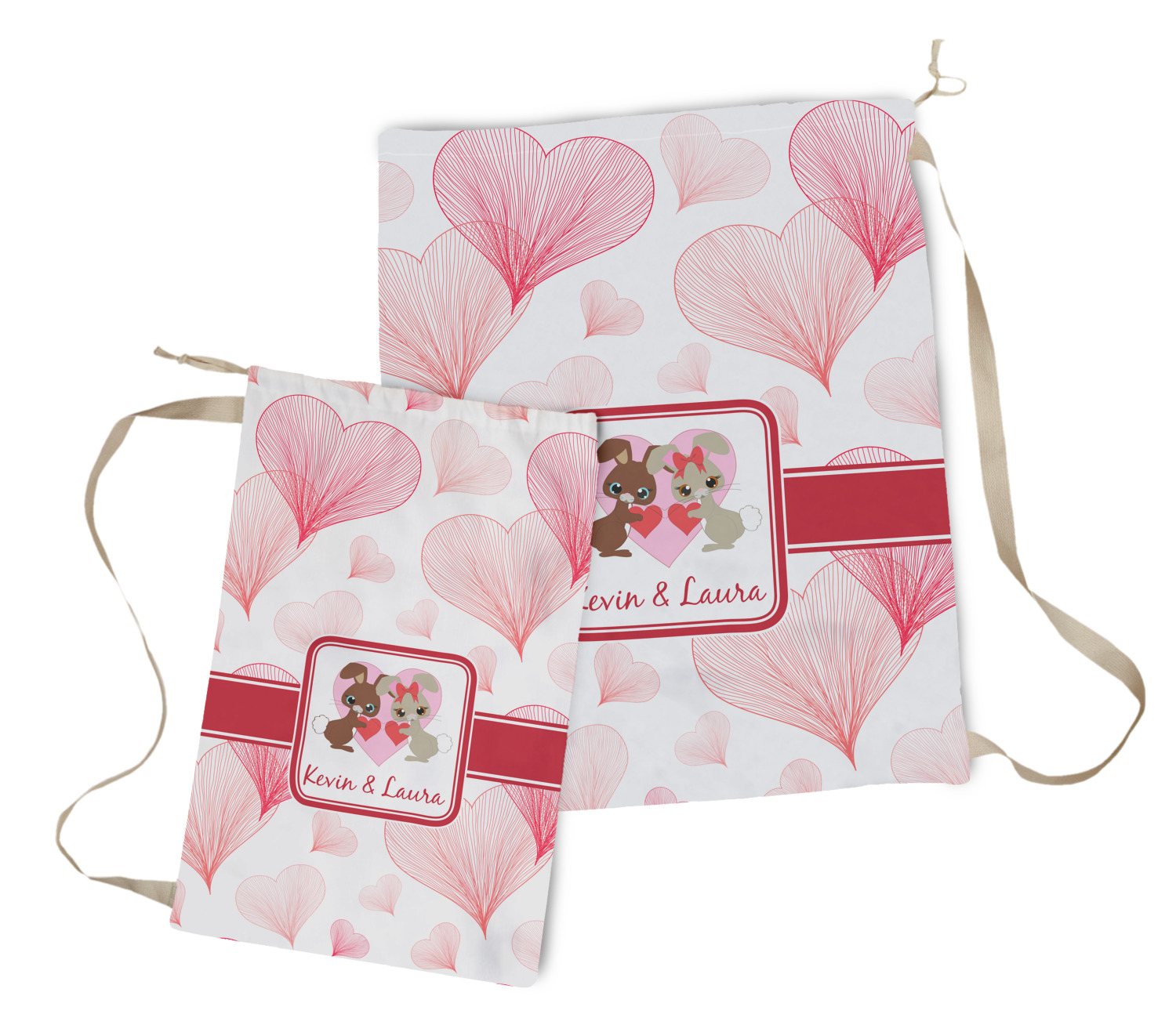 Carry your laundry in style with these customized laundry bags. Available in two sizes, featuring a natural colored woven strap and a cinch cord, these bags hold a lot of clothes or anything else you want to fit in them.