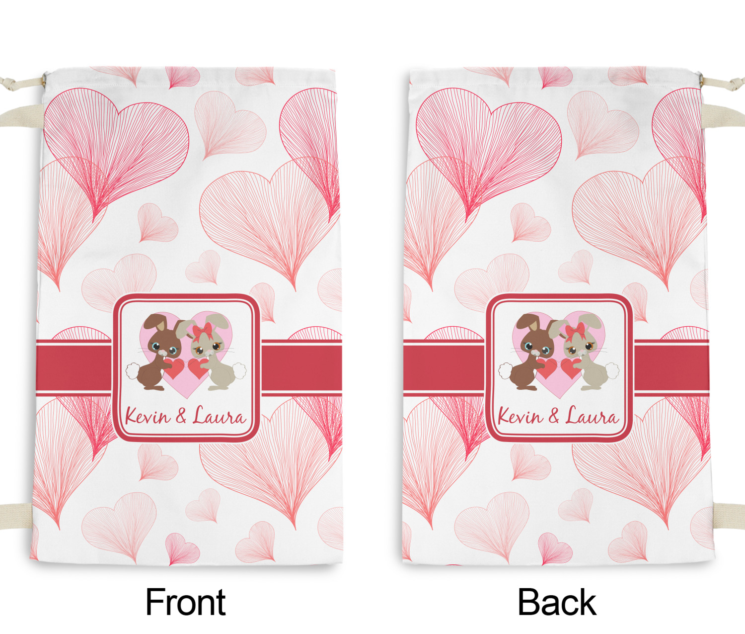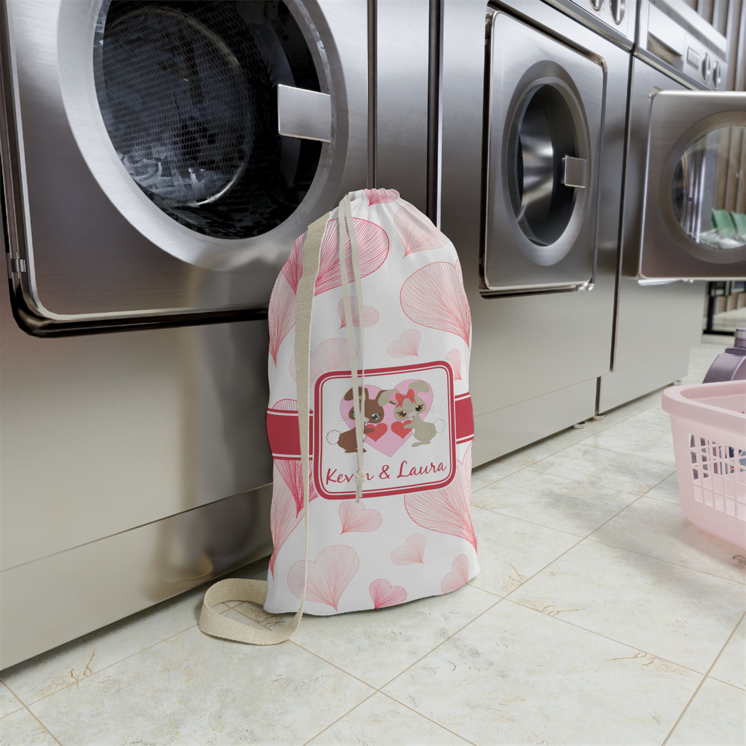 Carry your laundry in style with these customized laundry bags. Available in two sizes, featuring a natural colored woven strap and a cinch cord, these bags hold a lot of clothes or anything else you want to fit in them.