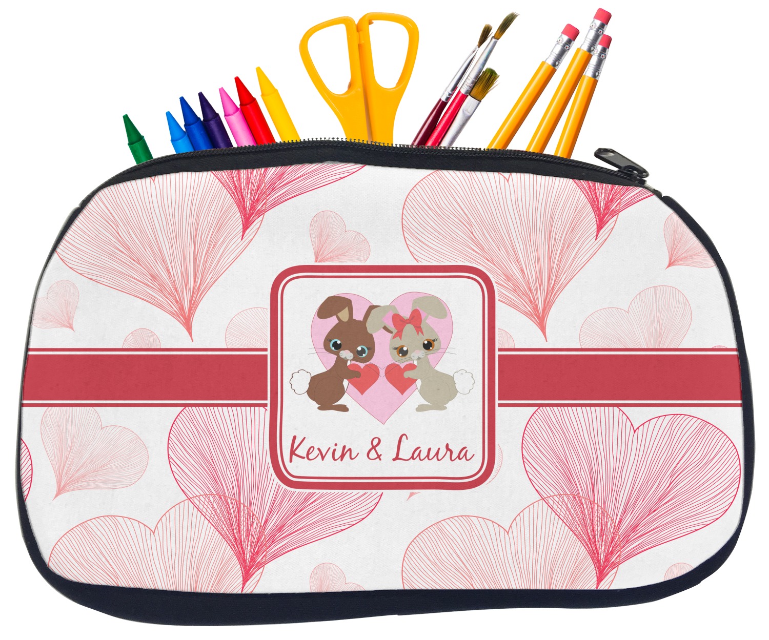 Built from durable neoprene, these pencil pouches, are water resistant, and prevent leaking ink from spilling into your backpack or purse. These custom pencil cases secure with a robust, black zipper. We print your personalized design on the front of this pouch, while the remaining sides a simple black color. These colored pencil cases [880] are sold in two sizes; our smaller version measures at 8.5 by 4.5 inches, while the medium measures at 10.5 by 6.5 inches. The smaller size is more suitable for holding pencils and pens, while our medium size can accommodate pencil sharpeners, scissors, and erasers.
