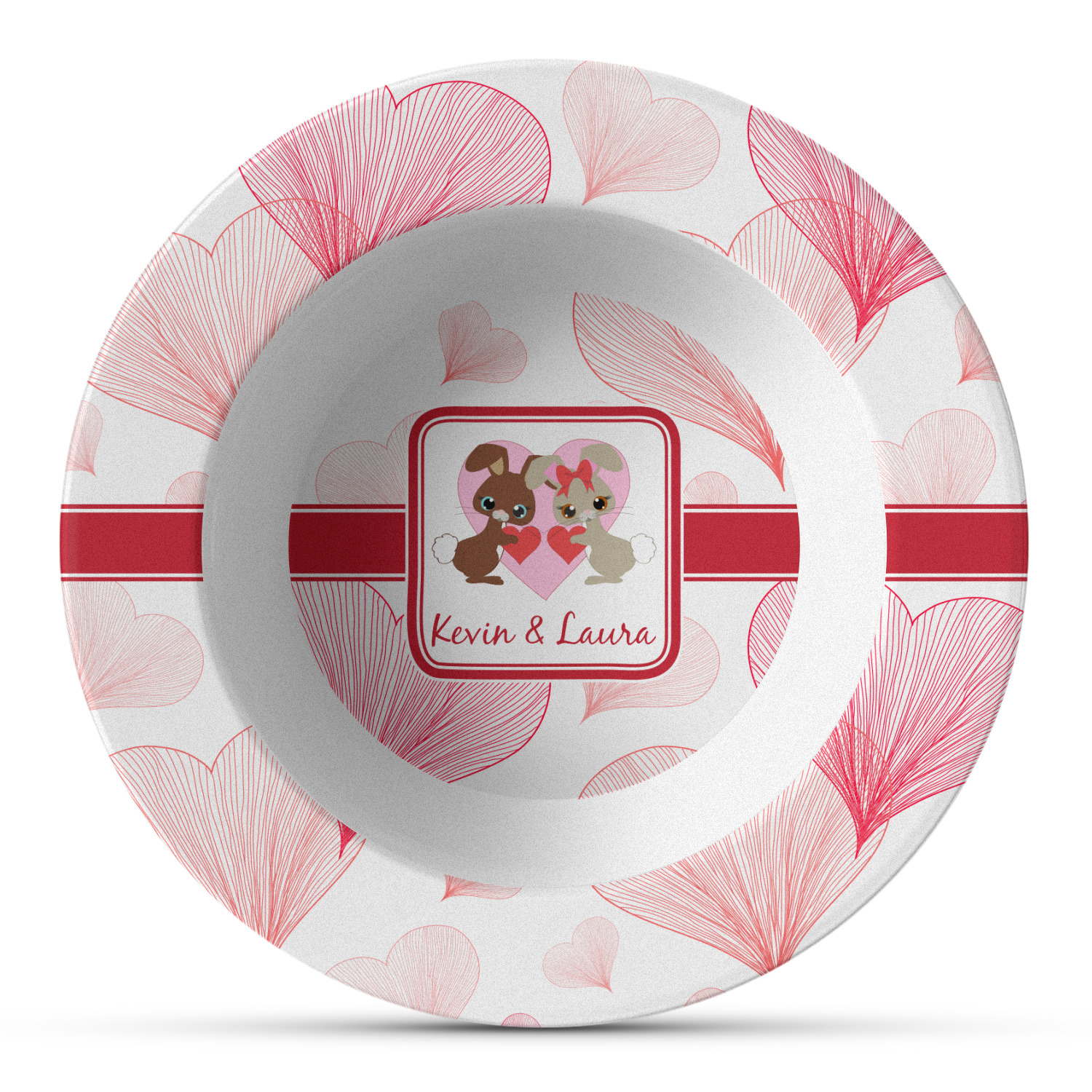 Made from a composite, thermo-set, polymer plastic, these dinner bowls have the versatility, durability, and weight of a melamine bowl without any of the downsides of melamine. Unlike melamine dinnerware, these bowls can withstand high heat. These custom plastic bowls can even handle temperatures of up to 250 degrees Fahrenheit, for up to 60 minutes. The pieces of our plastic dinner set are never made with harmful chemicals, such as BPAs, formaldehyde, DEHPs. We display your personalization on the base of this bowl's interior, while the bowl itself has an 8.75" diameter and is 1.75" tall.