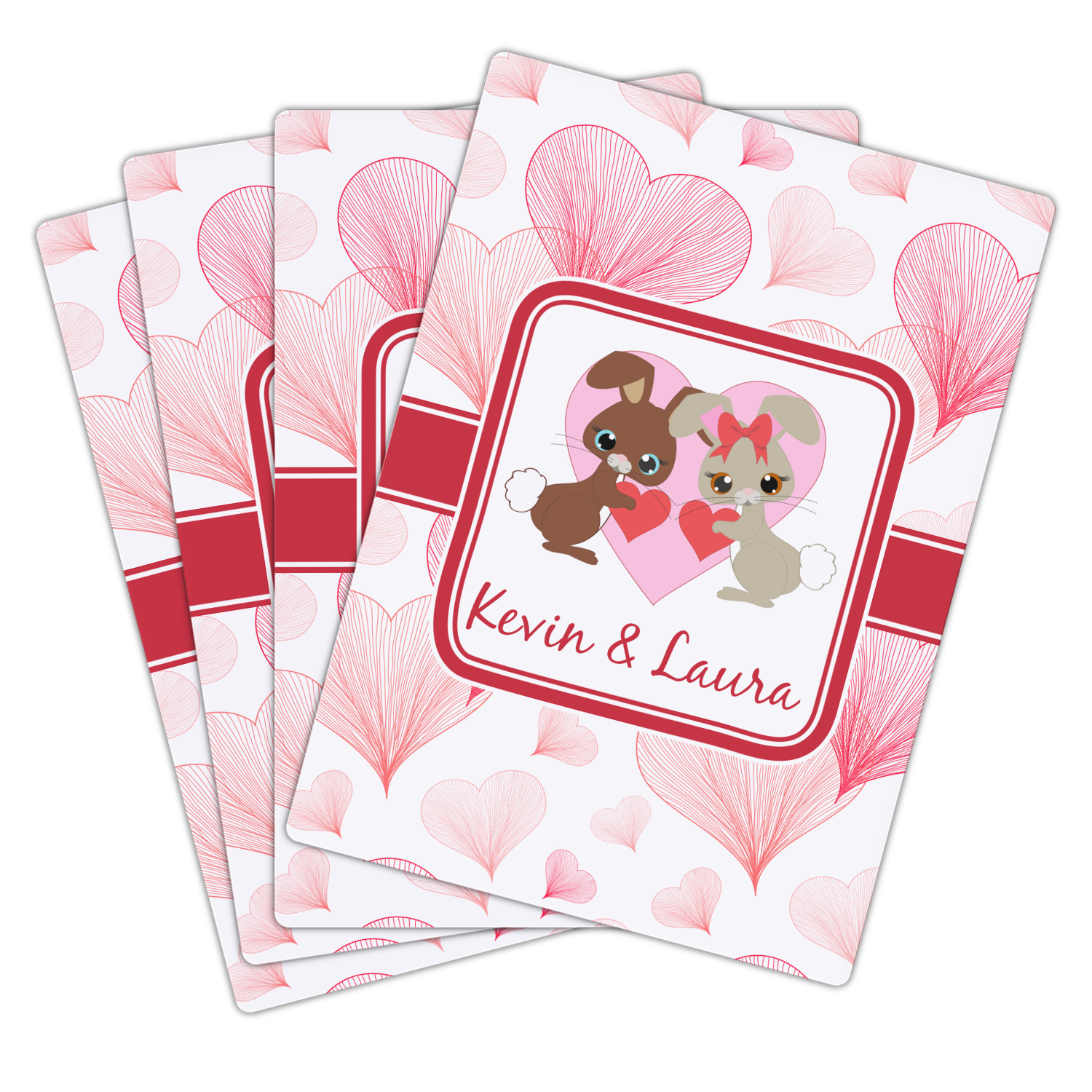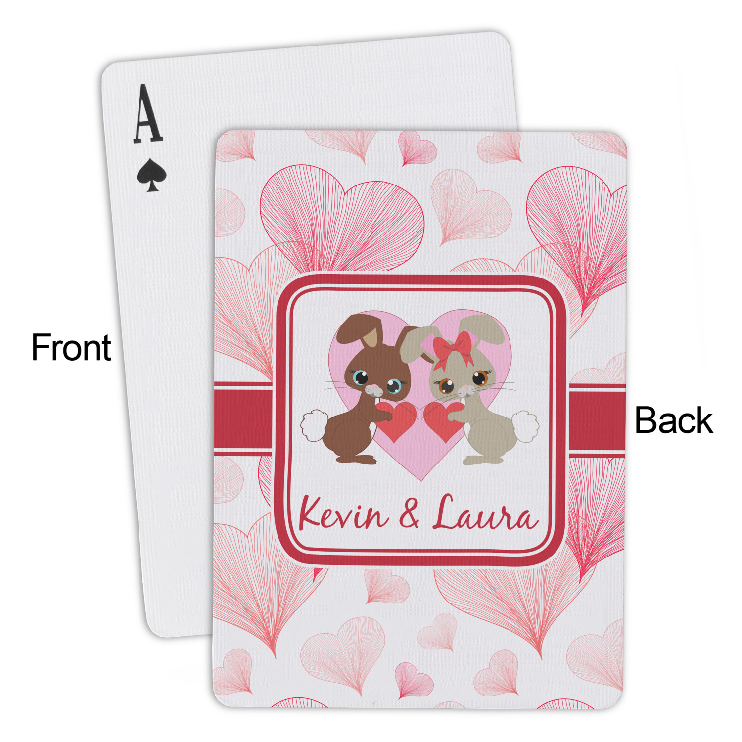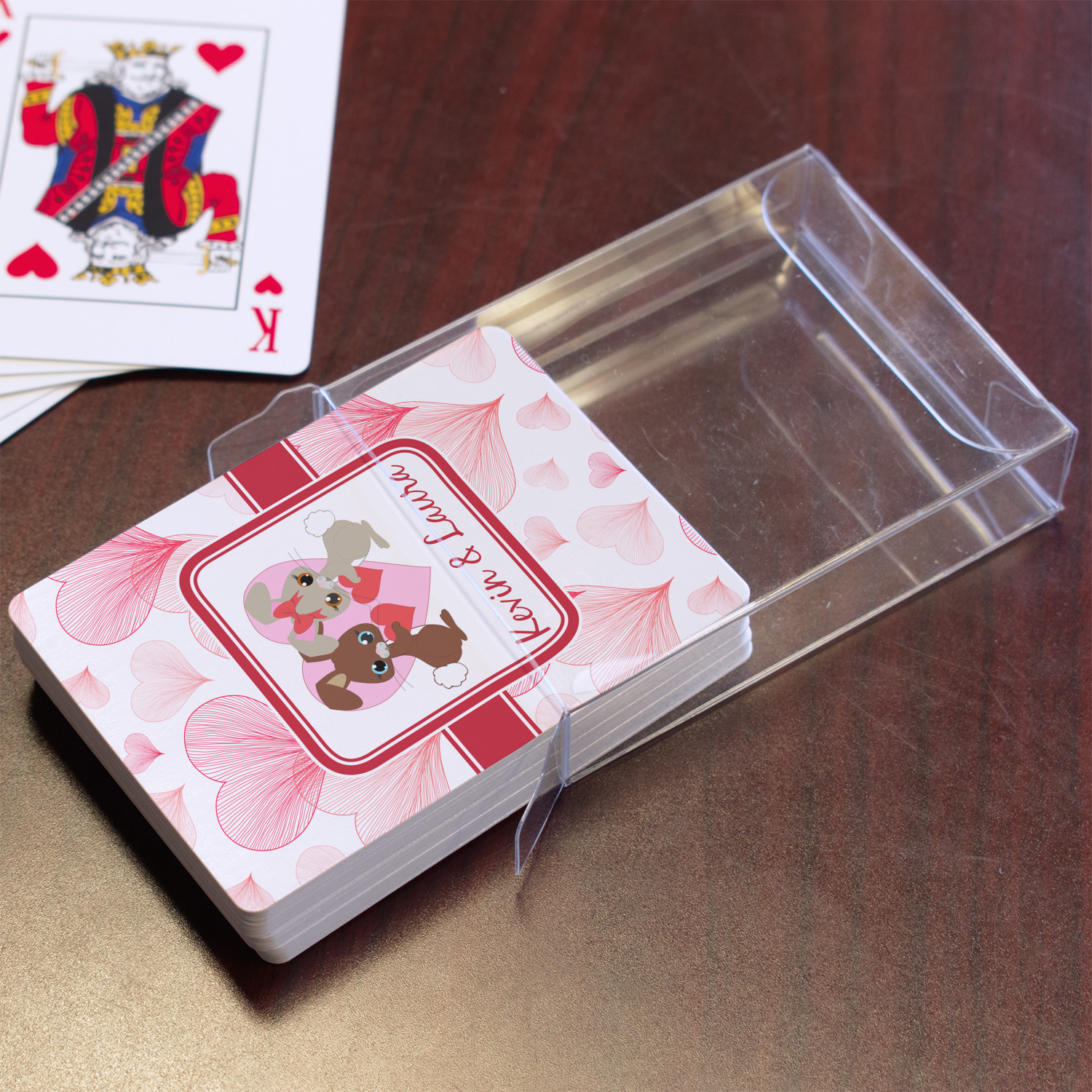 The customization / personalization is printed on the back side. The playing cards have a low gloss coating on both sides. The cards are packaged in a clear plastic box.