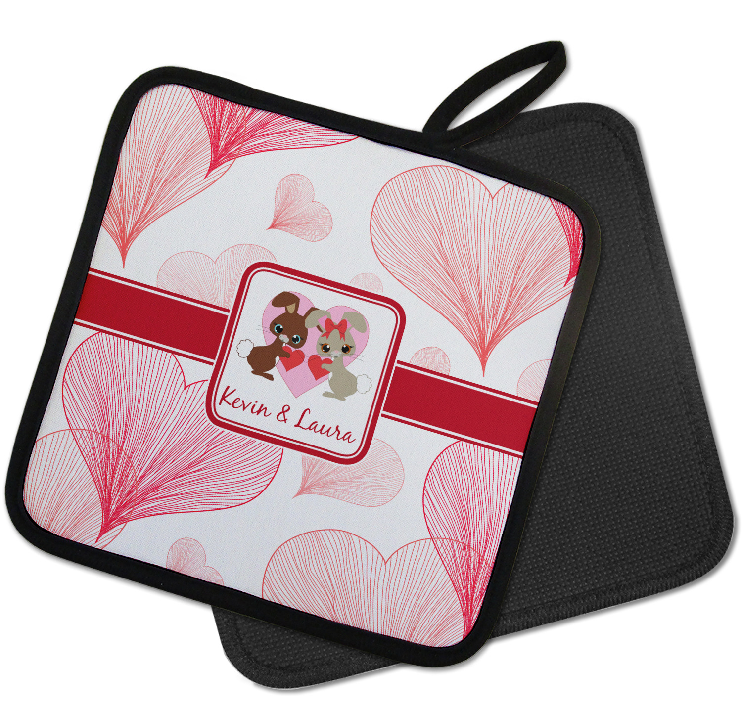 Our personalized pot holders feature a neoprene front that displays your personalization in vibrant colors. The backing of the hot pot holder is rubberized; the textured backing allows you to have a great grip when using this custom pot holder. The two materials are joined with a sleek, black trim, and the holder also includes an attached loop for hanging and storage. The pot holder is approximately 8.75 inches by 8.75 inches and 0.25 inches tall, while the fabric loop is 2.5 inches long. You can purchase a kitchen pot holder by itself or as a set of 2. We also offer a set including one pot holder and one oven mitt.