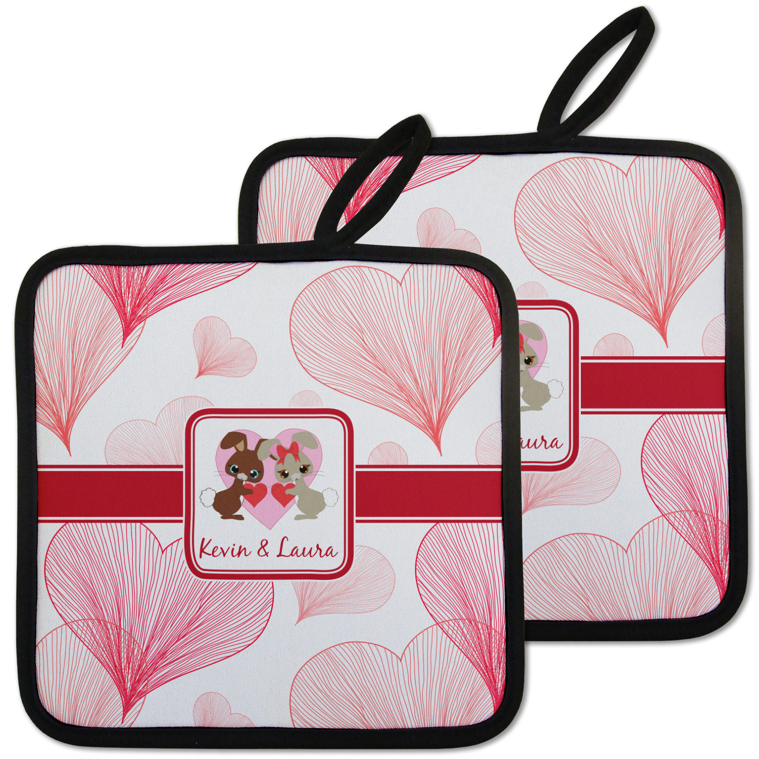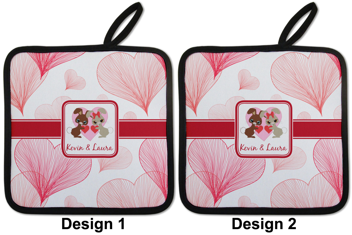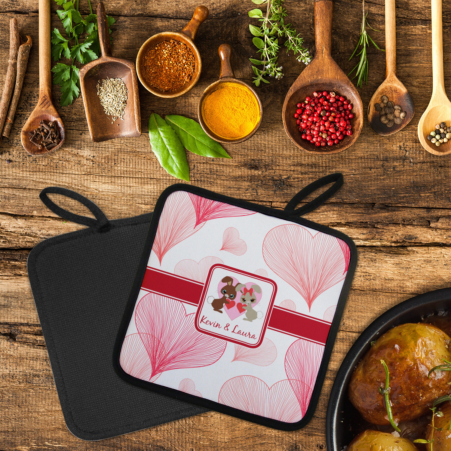 Our personalized pot holders feature a neoprene front that displays your personalization in vibrant colors. The backing of the hot pot holder is rubberized; the textured backing allows you to have a great grip when using this custom pot holder. The two materials are joined with a sleek, black trim, and the holder also includes an attached loop for hanging and storage. The pot holder is approximately 8.75 inches by 8.75 inches and 0.25 inches tall, while the fabric loop is 2.5 inches long. You can purchase a kitchen pot holder by itself or as a set of 2. We also offer a set including one pot holder and one oven mitt.