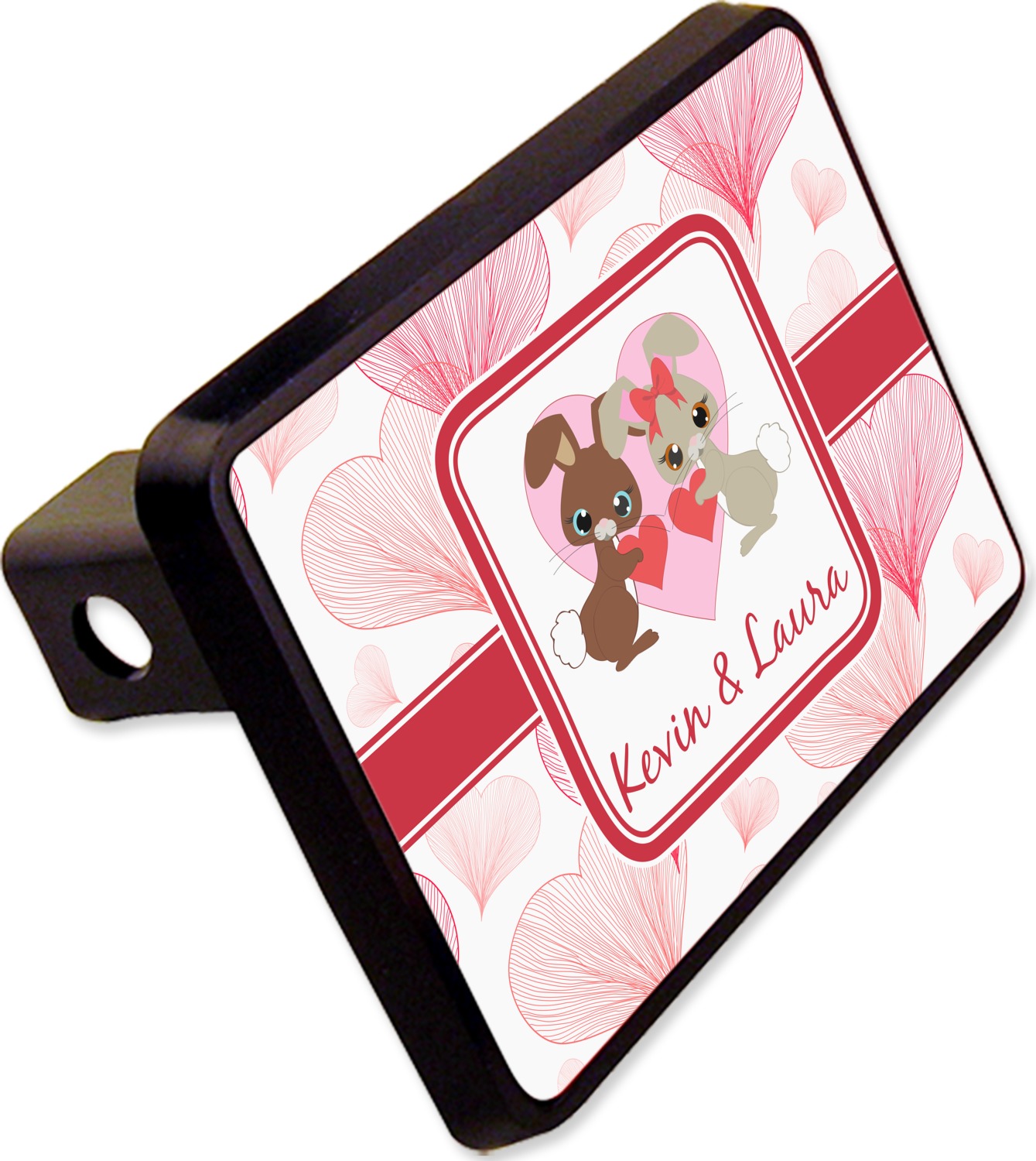 Our receiver hitch covers are molded, durable, and available in a size that fits 2in., square receiver holes. This model is best suited for a Class 3 or Class 4 hitch, but please consult our hitch sizing guide to make an informed purchase. We print your design on the surface of the rectangular cover, while the rest of the cover is a sleek, black color. The design's vibrancy will last up to 2 years in harsh sunlight. Designed for easy attachment, the cover slides easily into your trailer hitch and can be secured using a pin (not included).