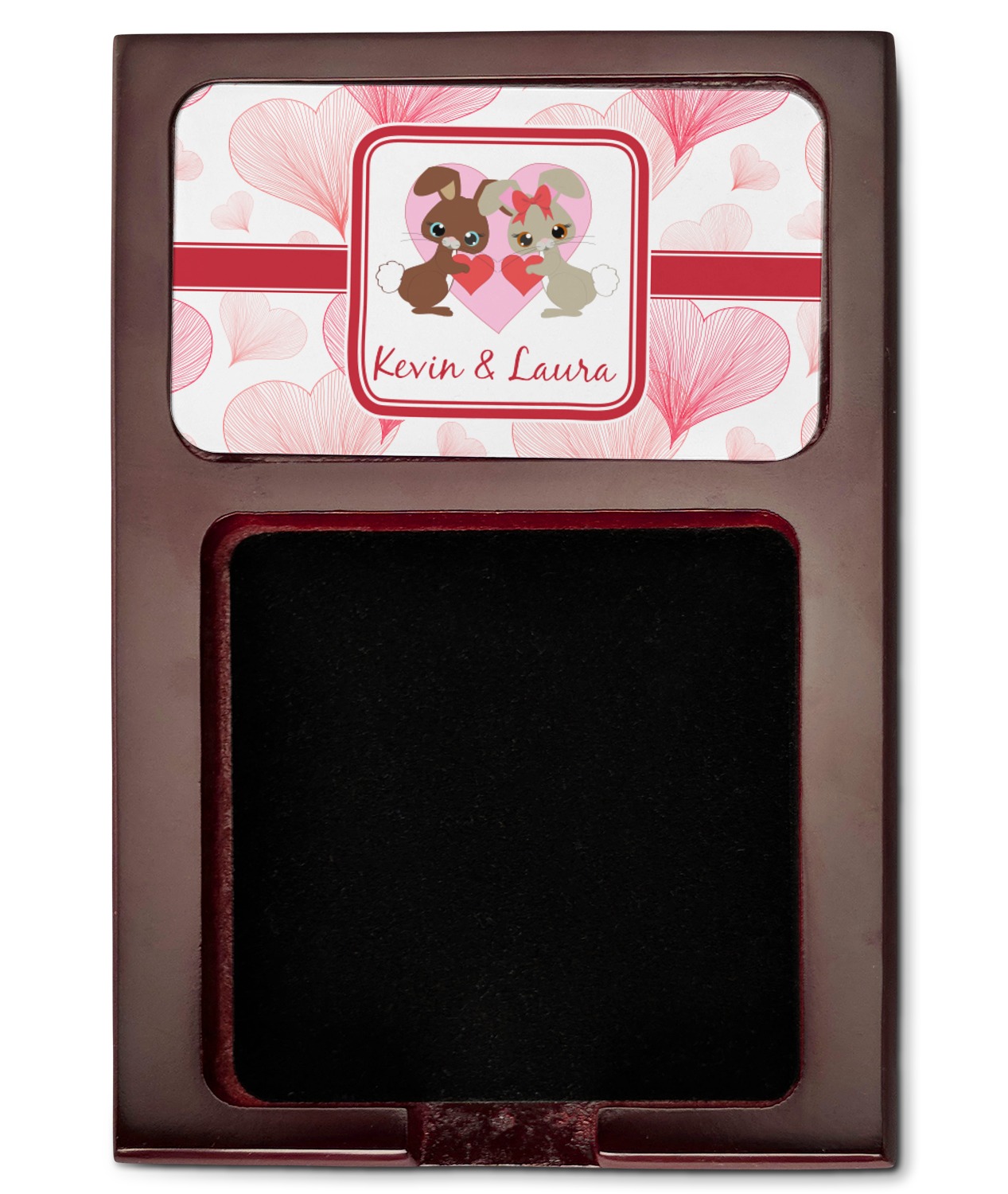 Crafted from a fine mahogany, this post it note holder is in the shade of a dark, cherry color. The dispenser itself is about 4.25 by 6.25 by 0.75 inches. You can place your 3 by 3 inch sticky notes in the indentation below the nameplate. We print your customization onto the nameplate that rests above the velvety indentation.