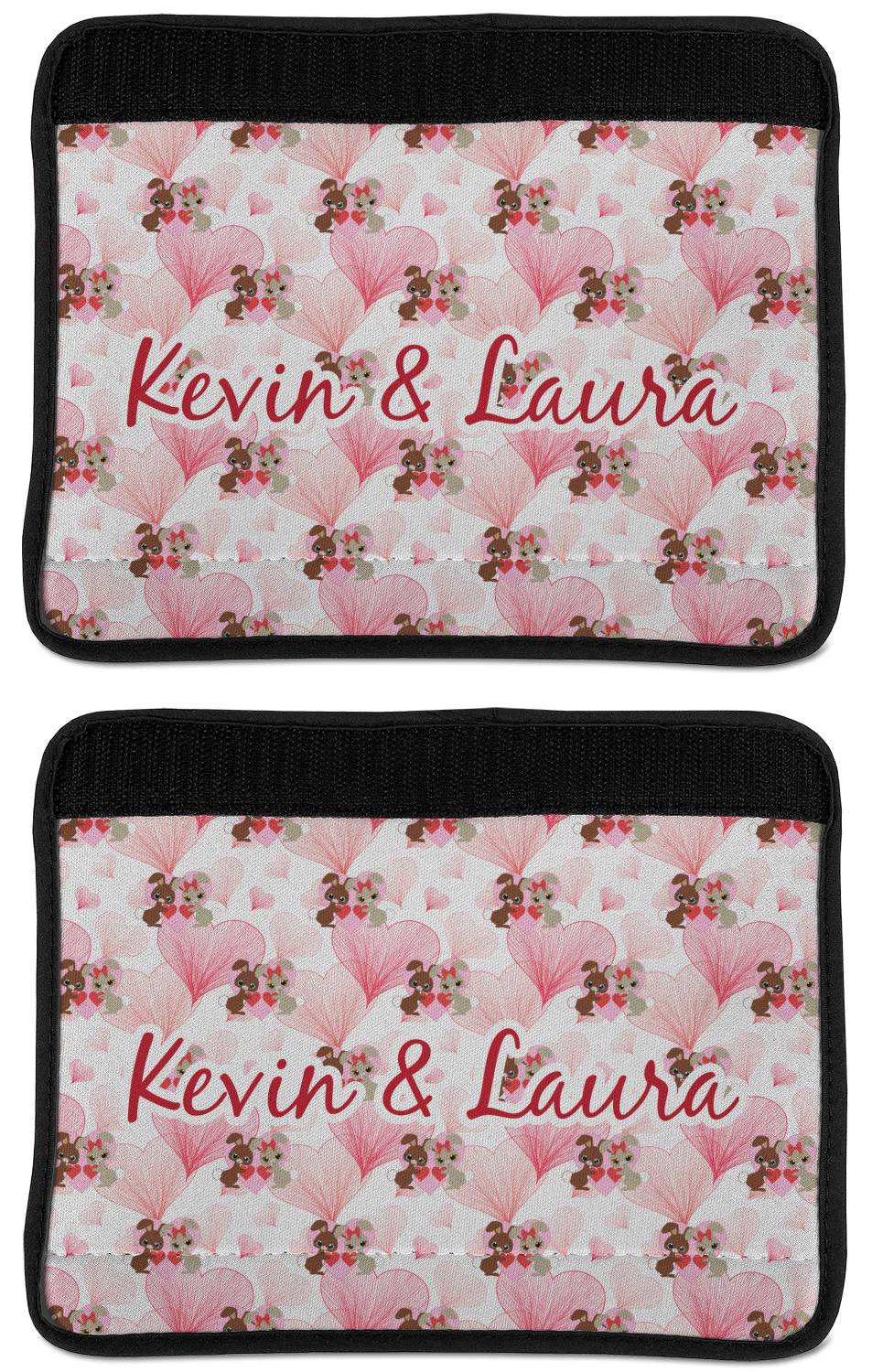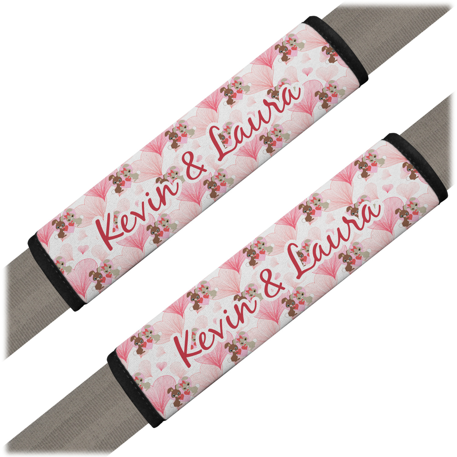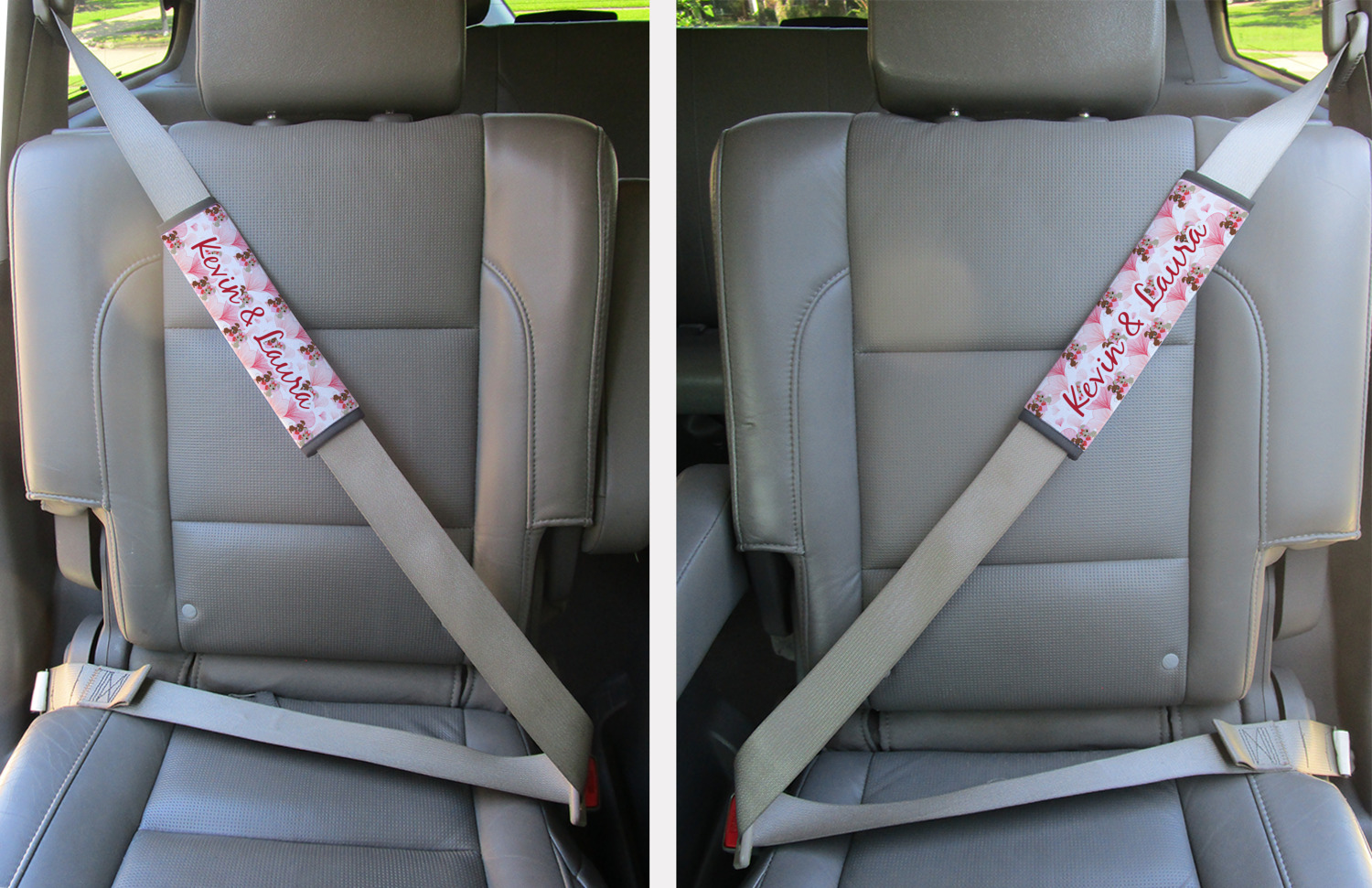 Made from neoprene, our seat belt strap covers wrap around the belt itself and have a Velcro tab for easy attachment and closure. The belt's edges are trimmed with a black polyester for a secure finish. Each cover is 9.5 by 7 inches when open and 9.5 by 2.5 inches when closed. We print your personalized design on the face of the seat belt pad.