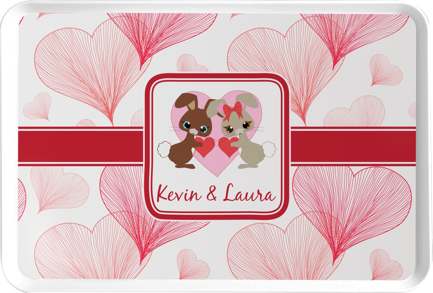 Made from a heavy melamine, these decorative trays are break resistant and are BPA free. At 14" x 9.25", these serving dishes are spacious enough to accommodate several drinks, bowls, or more. The tray features ridges underneath that allow for a sturdy stance upon any table or counter-top. We display your customization at the bottom of the tray's interior, while the remaining sides of the tray are a chic white.