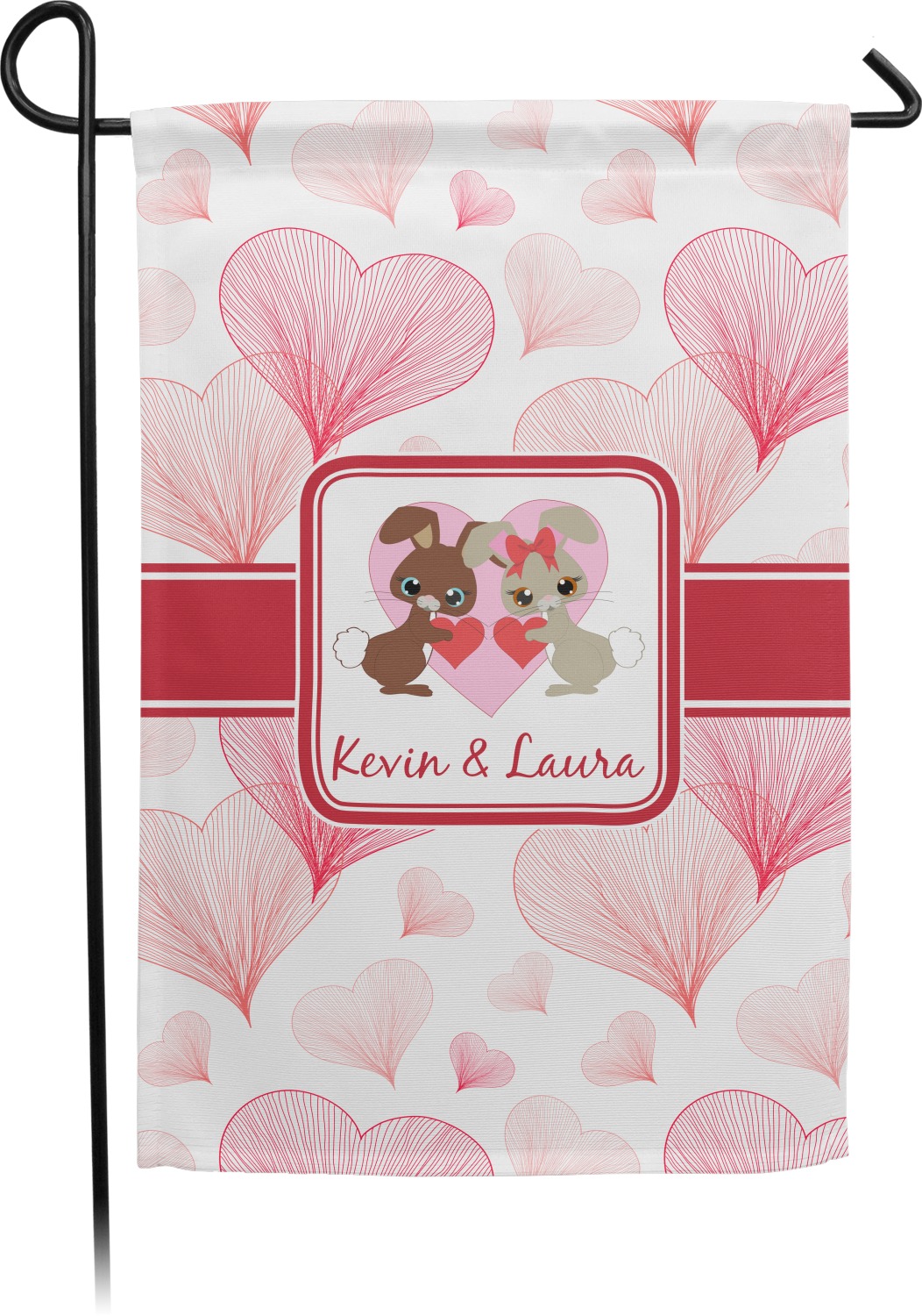 These custom garden flags are made of a durable, double-ply, polyester weave, allowing them to withstand the elements year round. The small flags measure at approximately 12 by 18 inches. The large flags measure out to 28 by 37 inches. You can order these decorative flags with your customization printed on the front only, or the front and back.
