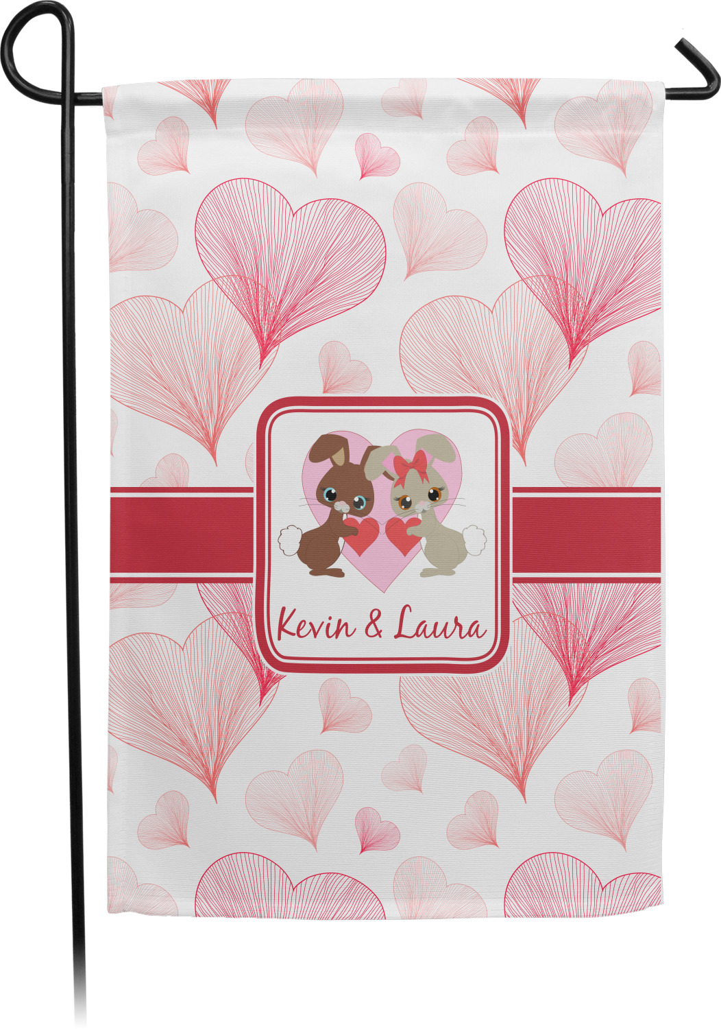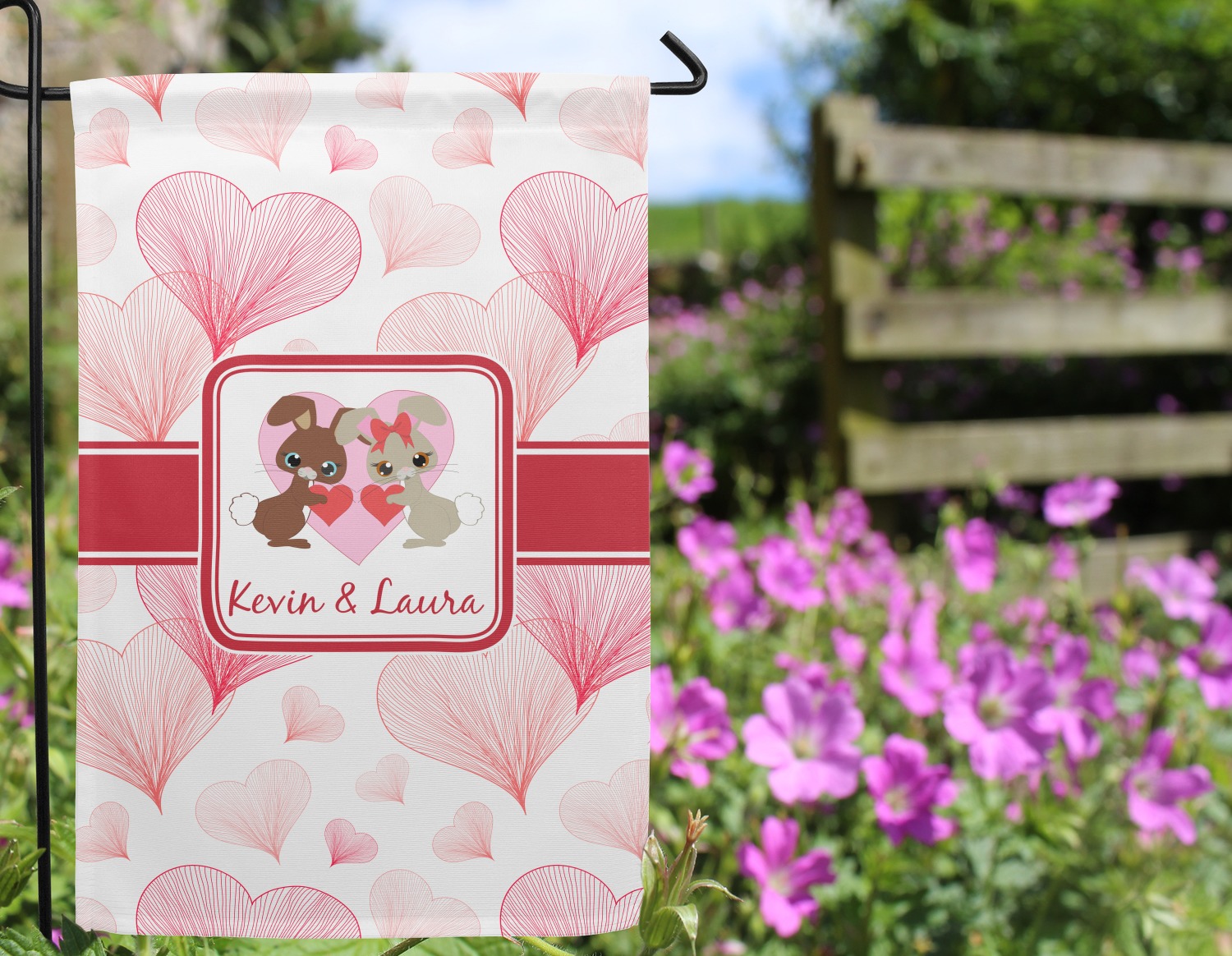 These custom garden flags are made of a durable, double-ply, polyester weave, allowing them to withstand the elements year round. The small flags measure at approximately 12 by 18 inches. The large flags measure out to 28 by 37 inches. You can order these decorative flags with your customization printed on the front only, or the front and back.