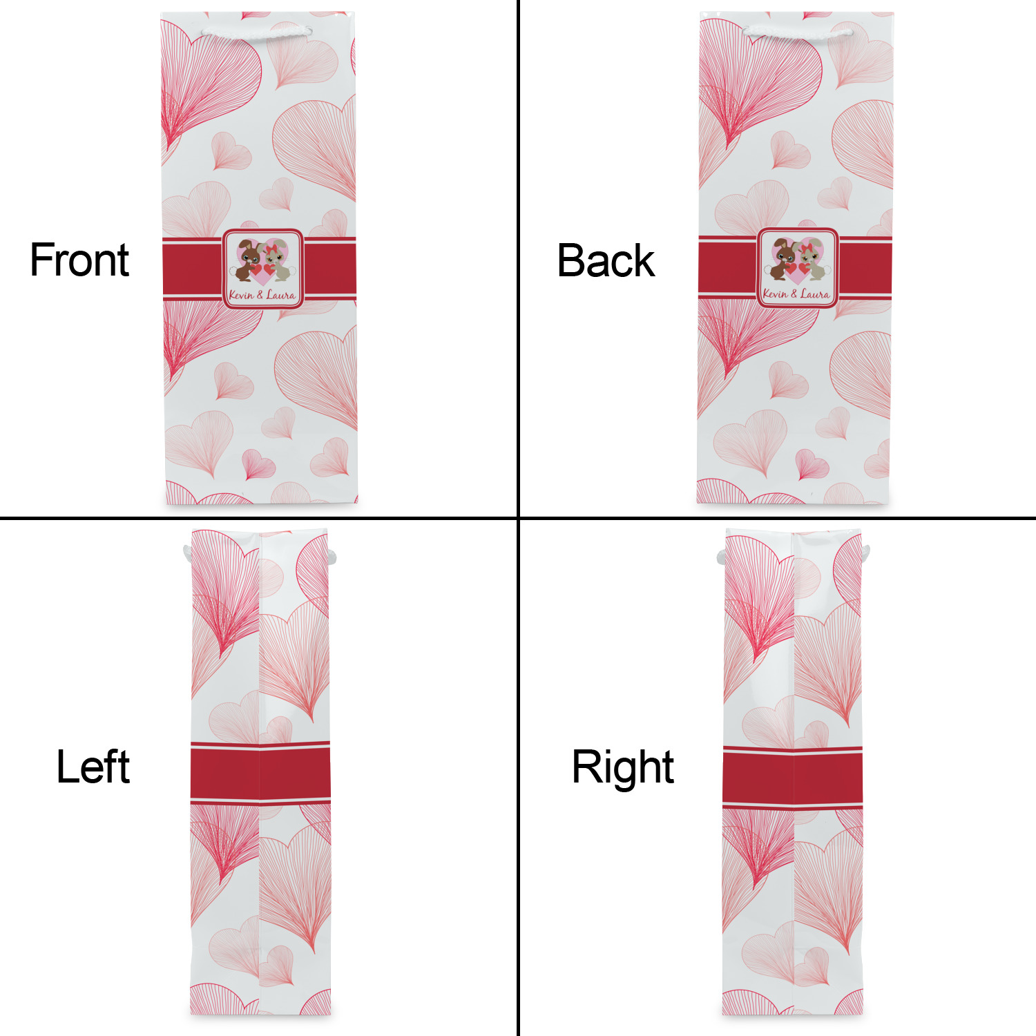 Our wine bags are printed on premium paper. The bags are then cut, scored and folded. The handles and cardstock base it attached. These custom wine bags are printed and made in the USA.