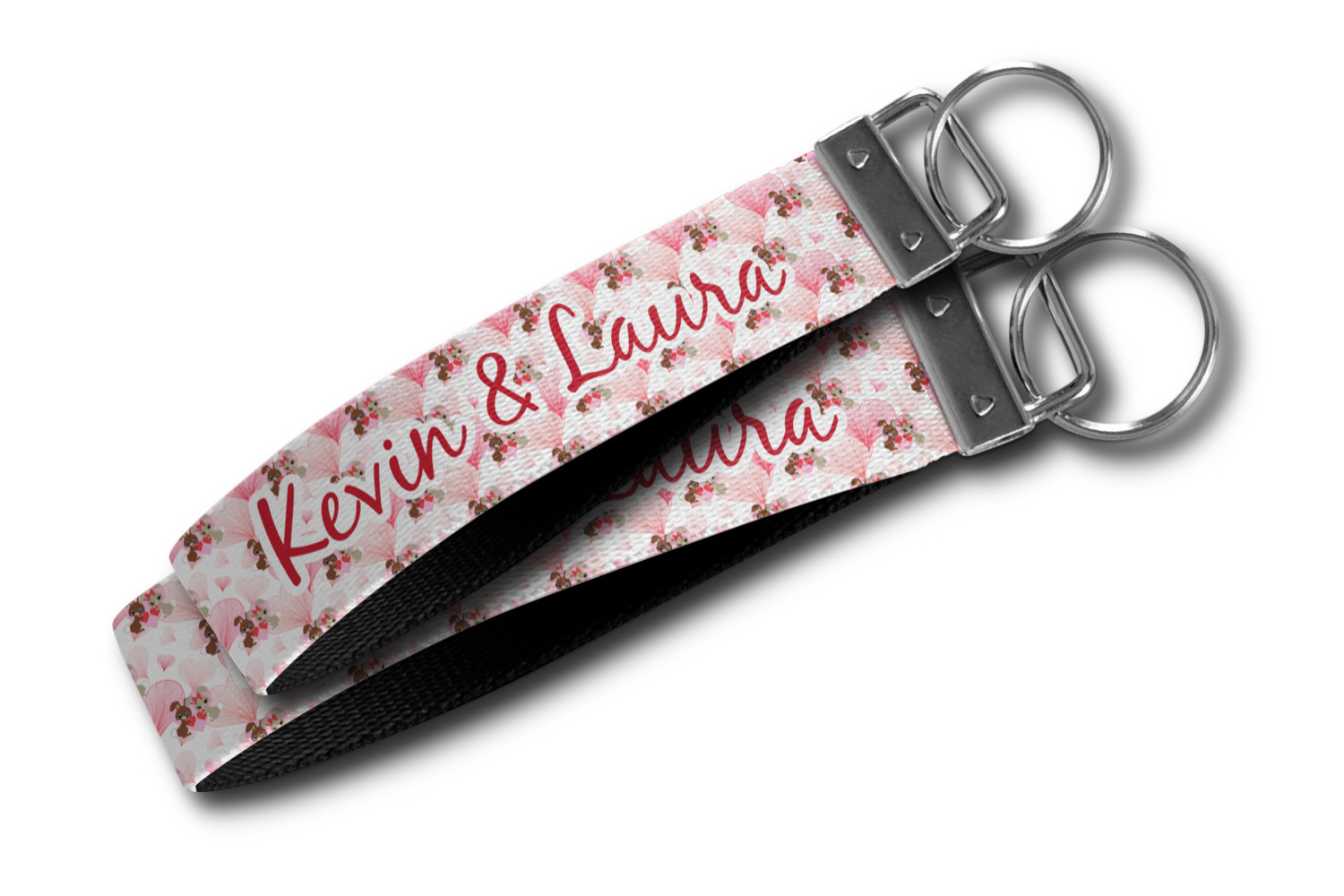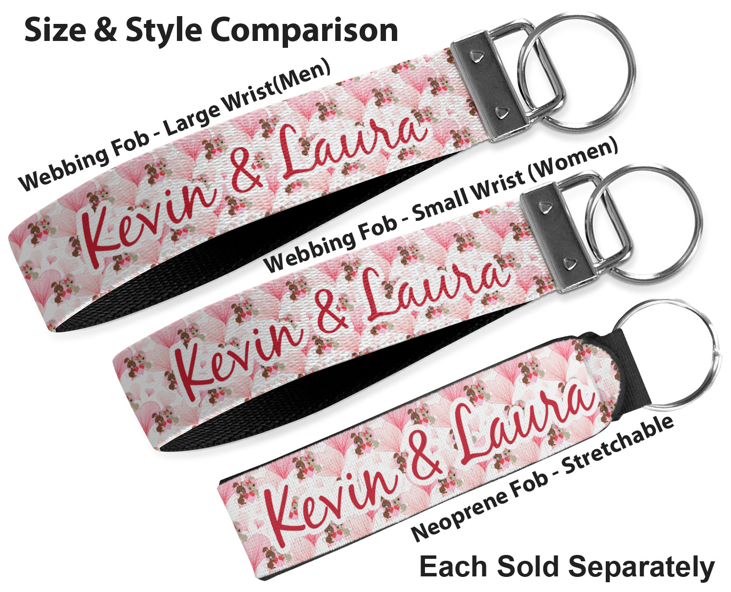 These key fob keychains are made from a polyester weave, right here in the USA. They feature a silver, metal clasp, attached to a round keyring. The piece gives the personalized wristlet a beautiful, finished look. Your customized design is printed on the outside of the keychain strap. We carry these wristlets in two sizes: small, which is 5 inches in width, and large, which is 5.5 inches in width.