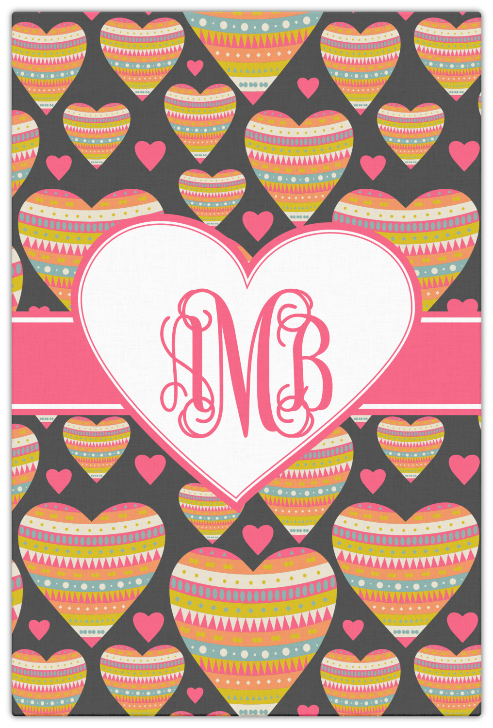 This Valentine's Day design looks sweet enough to eat. Multicolored hearts, each one filled with stripes and triangles and patterns of all kinds, are set on a crisp white background.