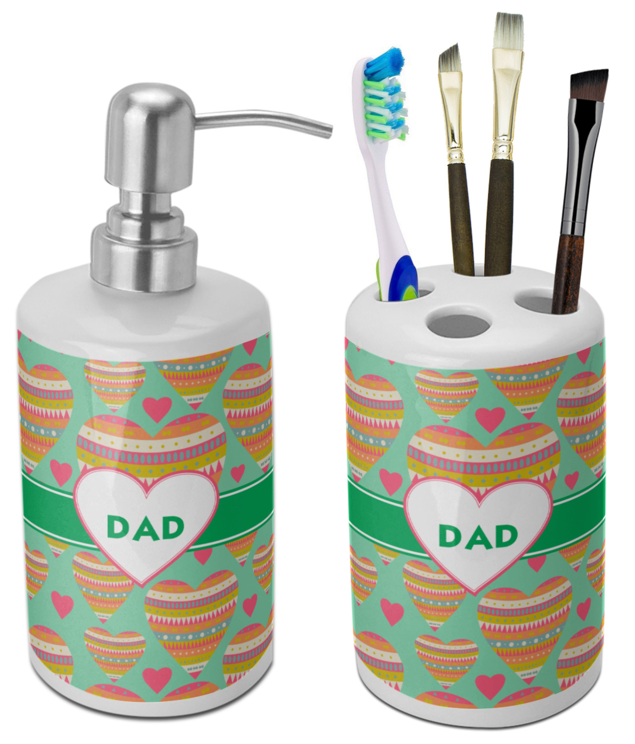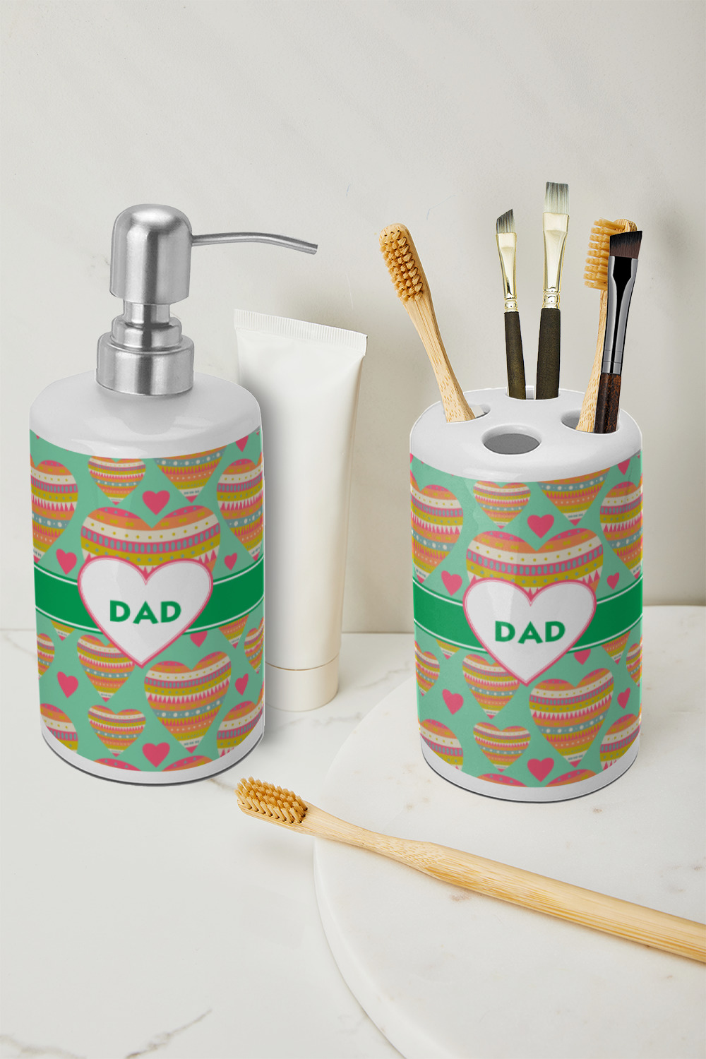 This two piece, ceramic bathroom set will add the perfect splash of color to any bathroom. This set includes one pump dispenser, ideal for soap or lotion, and one toothbrush holder with four holes. Although originally designed for toothbrushes, the holder will also hold make-up brushes, nail files, and other bathroom tools.