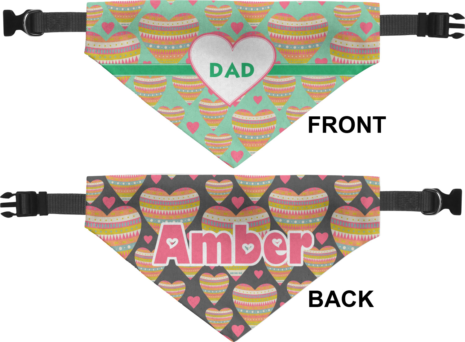 We print the front and back of these dog bandanas with your customized design. The bandana itself is made from a durable polyester, sewn together with a gap large enough to accommodate any collar. Regardless, the bandana includes a plain black, canvas collar with plastic snaps, that can easily be removed if desired. These dog bandana collars are available in four sizes: small, medium, large, and extra large. Please see our sizing chart for more information regarding the dimensions of each size.