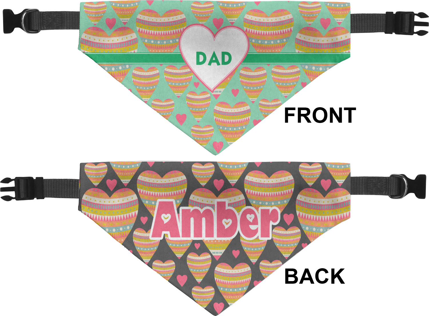 We print the front and back of these dog bandanas with your customized design. The bandana itself is made from a durable polyester, sewn together with a gap large enough to accommodate any collar. Regardless, the bandana includes a plain black, canvas collar with plastic snaps, that can easily be removed if desired. These dog bandana collars are available in four sizes: small, medium, large, and extra large. Please see our sizing chart for more information regarding the dimensions of each size.