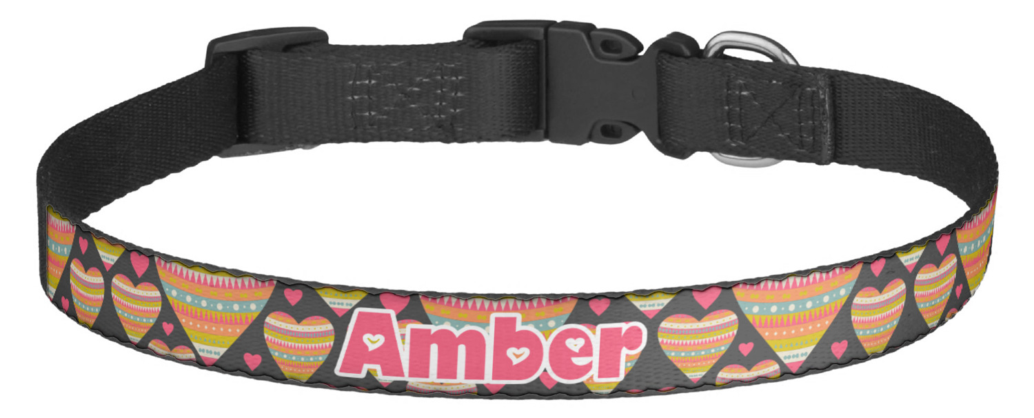 This sturdy collar, made from a durable nylon weave, will outlive your dog's episodes of excited tugging and pulling. Courtesy of its thick plastic buckle and adjuster, this collar is adjustable and accommodating of any dog. Structurally, the collar is a single piece of nylon weave that is sewn together, and features a solid metal loop where you can attach a leash or dog tag. We print and display your dog's name and pattern across the middle of the personalized dog collar.