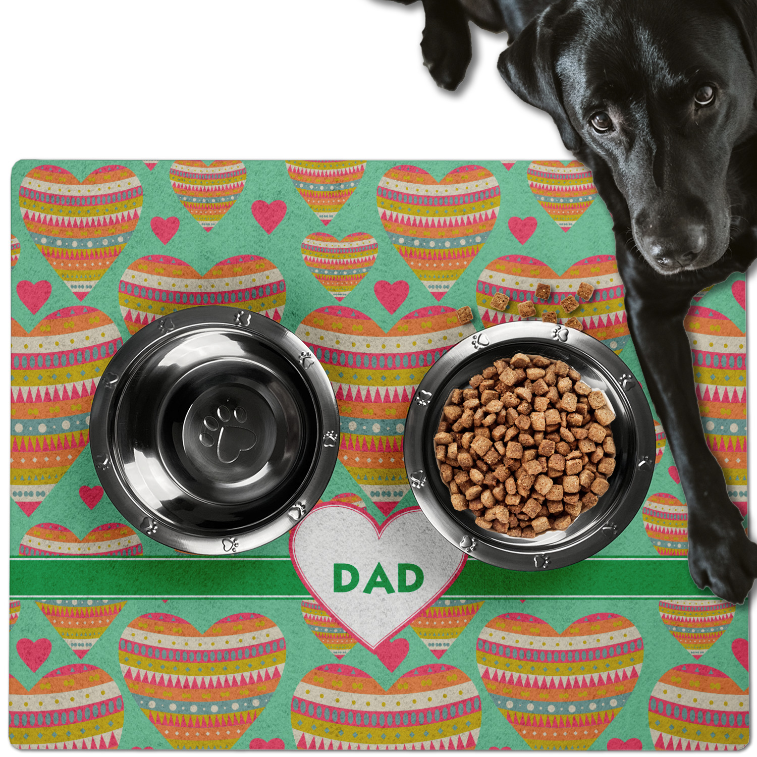 This dog bowl mat, fabricated from polyester, proudly displays your customized design on its top, while its bottom includes a non-slip rubber. This feature allows it to remain firmly in place, even when your dog spills his/her water. With 3 sizes available (18" x 12", 24" x 18", 30" x 24"), the pet food mat has ample space for both a food and water bowl for any sized dogs. Though specified for dogs' use, these mats are also a splendid option for cats.