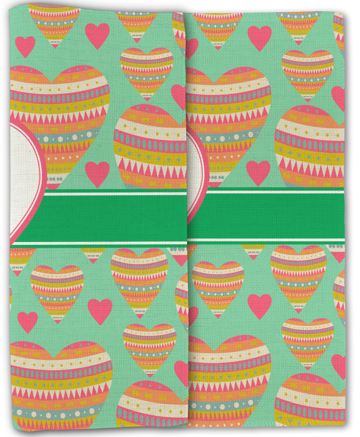 This Valentine's Day design looks sweet enough to eat. Multicolored hearts, each one filled with stripes and triangles and patterns of all kinds, are set on a crisp white background.