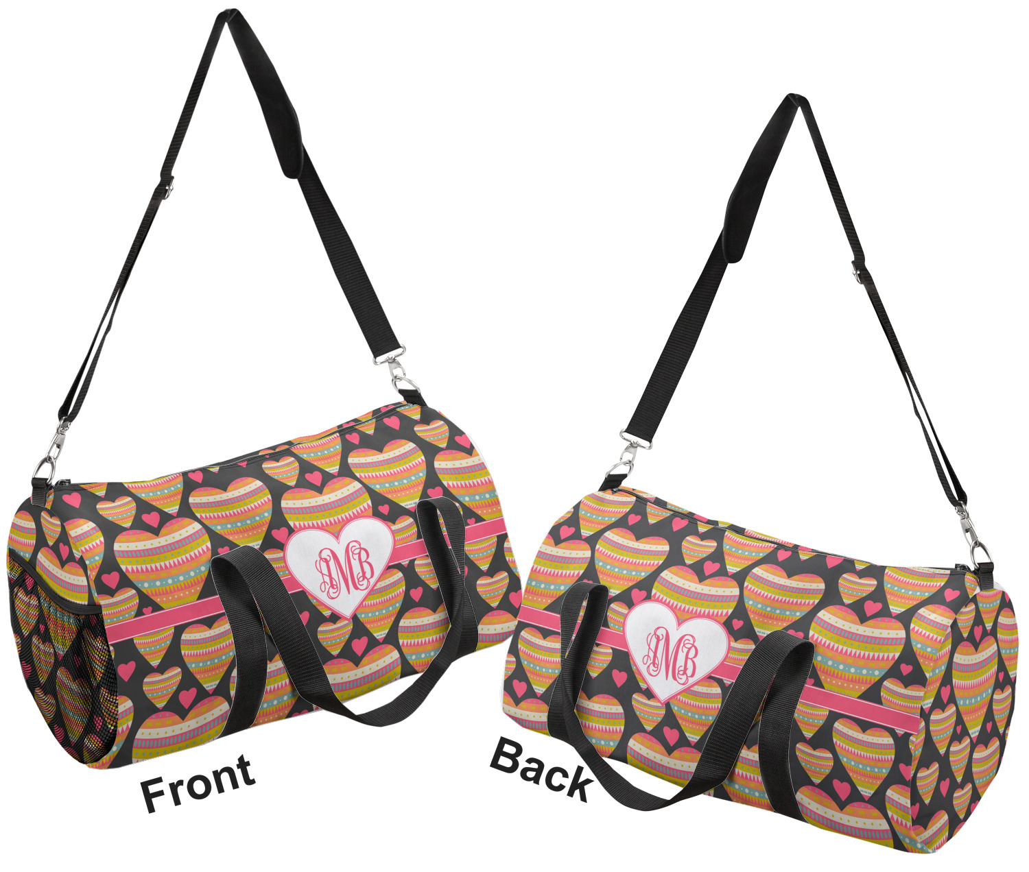 This duffle is a sturdy bag made of a canvas material. It comes in two sizes: Small (19"W x 9.5"H x 9.5"D) and Large (23"W x 12"H x 12"D). The bag is a cylindrical shape with a black adjustable strap and two handles. On one side is an elastic pouch to put a waterbottle or other small item. Your product will be sublimated with your design and is able to be designed on the front, back, and sides. Be sure to remember that the straps may cut into parts of your design if you upload your own artwork.