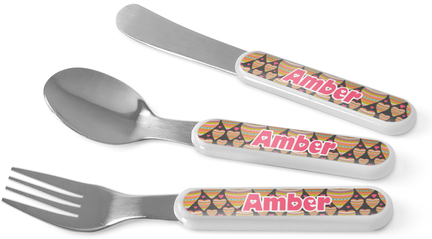 This set of kids' silverware includes a 5.5 inch spoon, fork, and knife, catered to your little one's needs. The prongs of this fork are flat and dull, while our spoon is small enough for tiny mouths, and the dullness of the knife itself resembles a butter knife, at most. These kids' utensils are made of stainless steel, while the handles are crafted from a durable plastic that will withstand the energy and use of your young one. We print your customization across the handles, making the cutlery set unique to your child only.