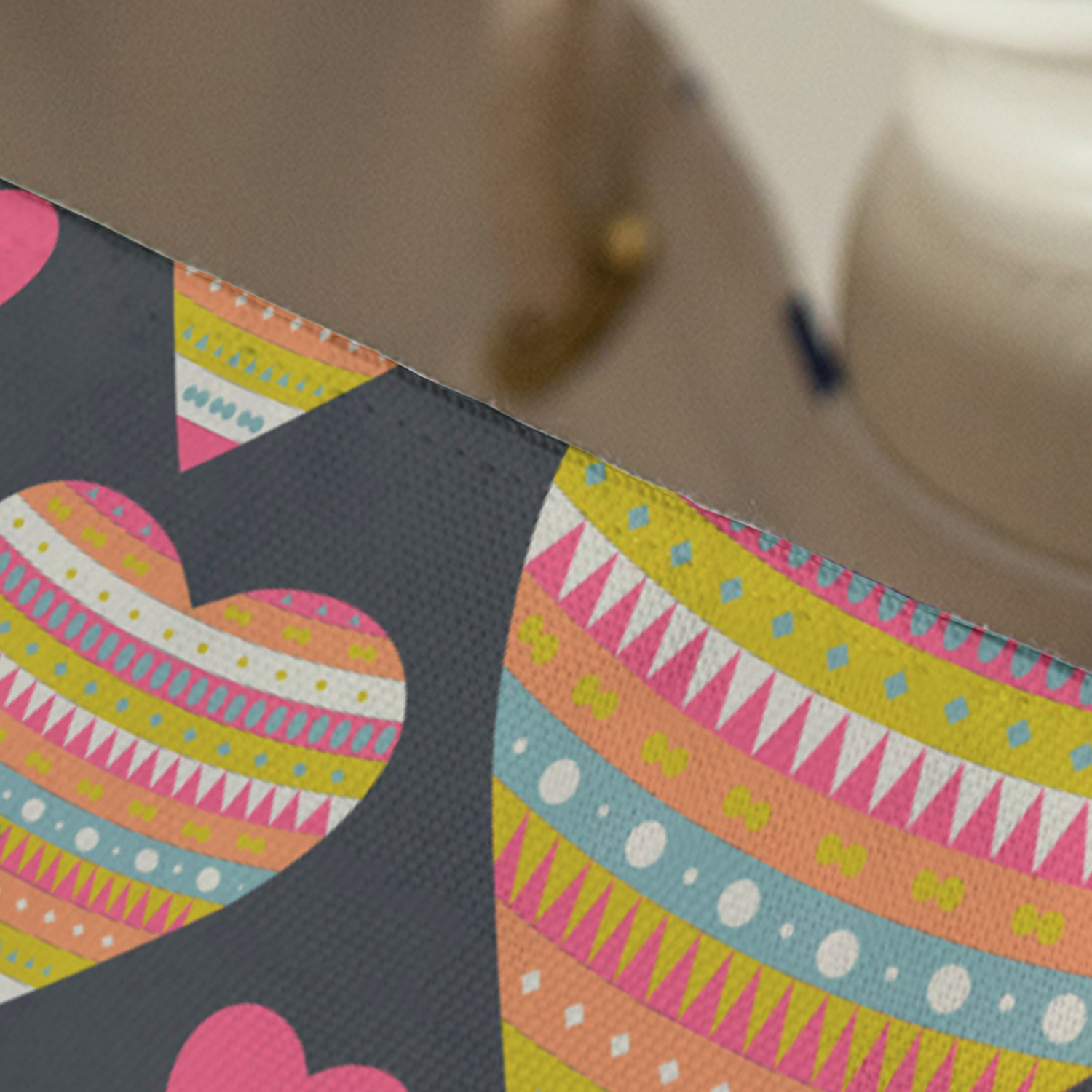 This Valentine's Day design looks sweet enough to eat. Multicolored hearts, each one filled with stripes and triangles and patterns of all kinds, are set on a crisp white background.