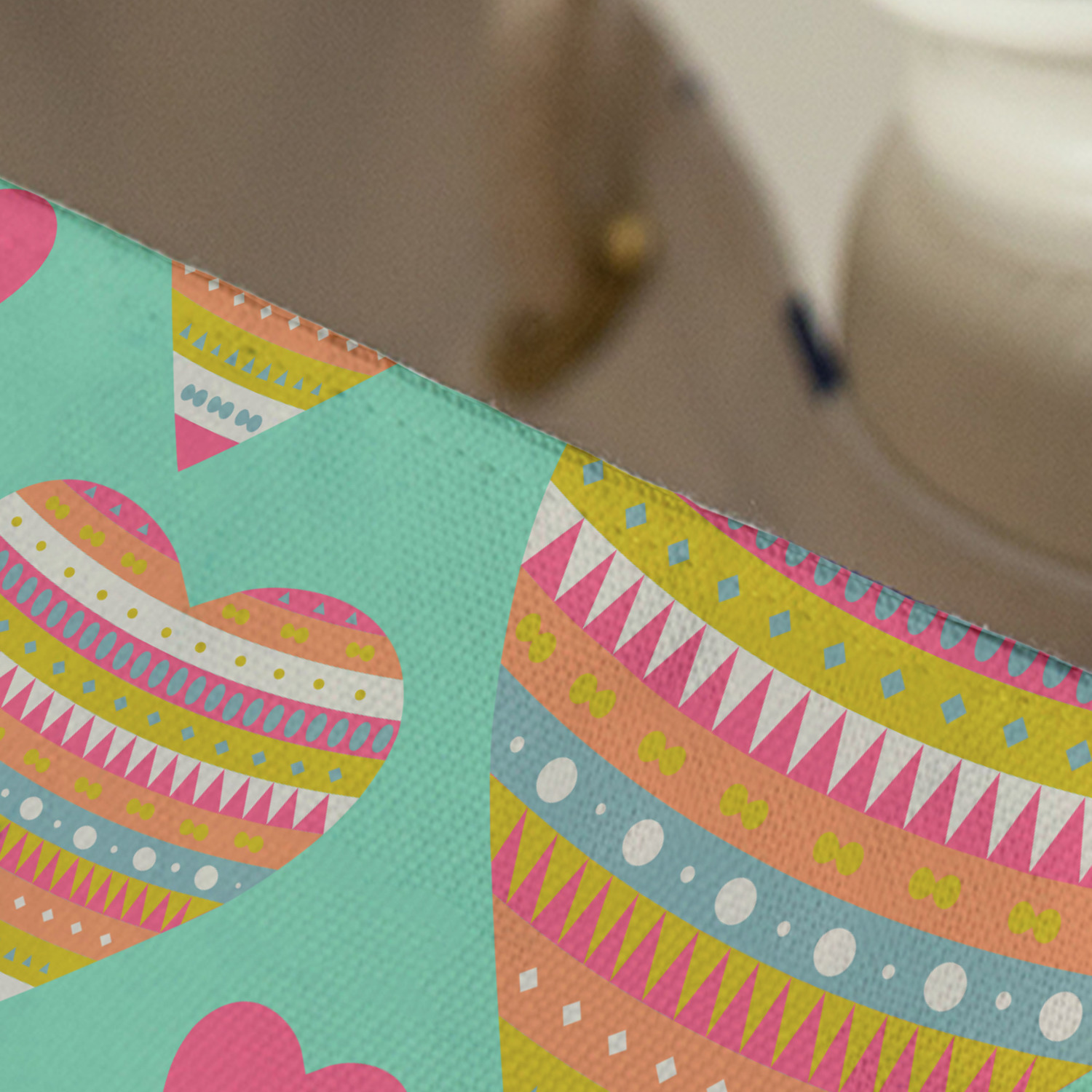 This Valentine's Day design looks sweet enough to eat. Multicolored hearts, each one filled with stripes and triangles and patterns of all kinds, are set on a crisp white background.