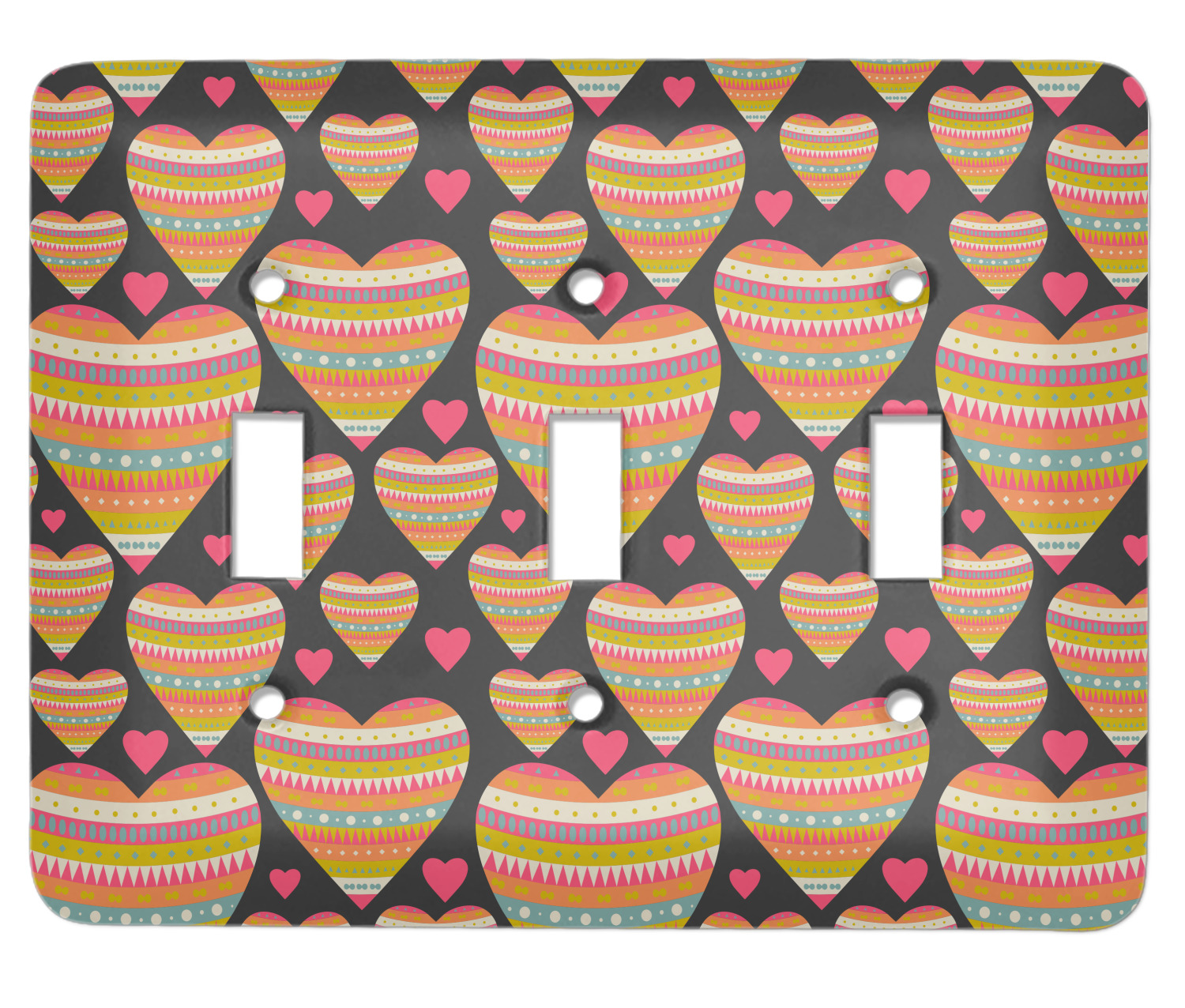 This Valentine's Day design looks sweet enough to eat. Multicolored hearts, each one filled with stripes and triangles and patterns of all kinds, are set on a crisp white background.