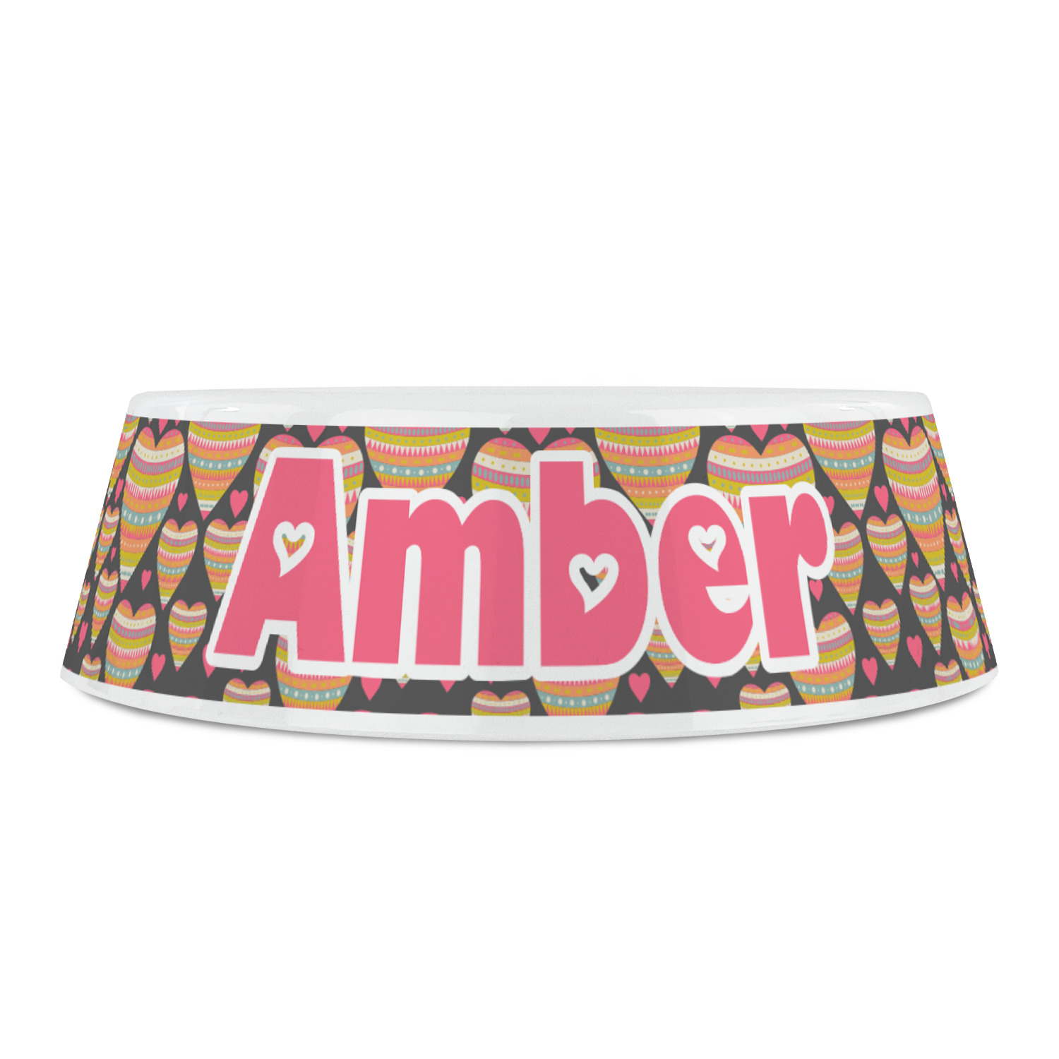 This Valentine's Day design looks sweet enough to eat. Multicolored hearts, each one filled with stripes and triangles and patterns of all kinds, are set on a crisp white background.