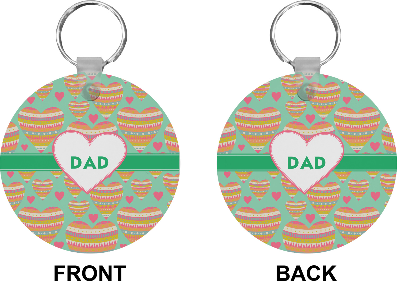 Our personalized keychains attach to the included metal, split key ring with a plastic, removable snap. Since a metal ring is included with your purchase, you have the liberty to keep your keys together on the ring, with or without your unique keychain. We offer this keychain in three different shapes: circle, heart, or diamond. We print your personalized design(s) on both sides of the key chain, and the surface has a glossy, reflective finish that only emphasizes your design. Each keychain is approximately 2.25 by 2.25 inches.