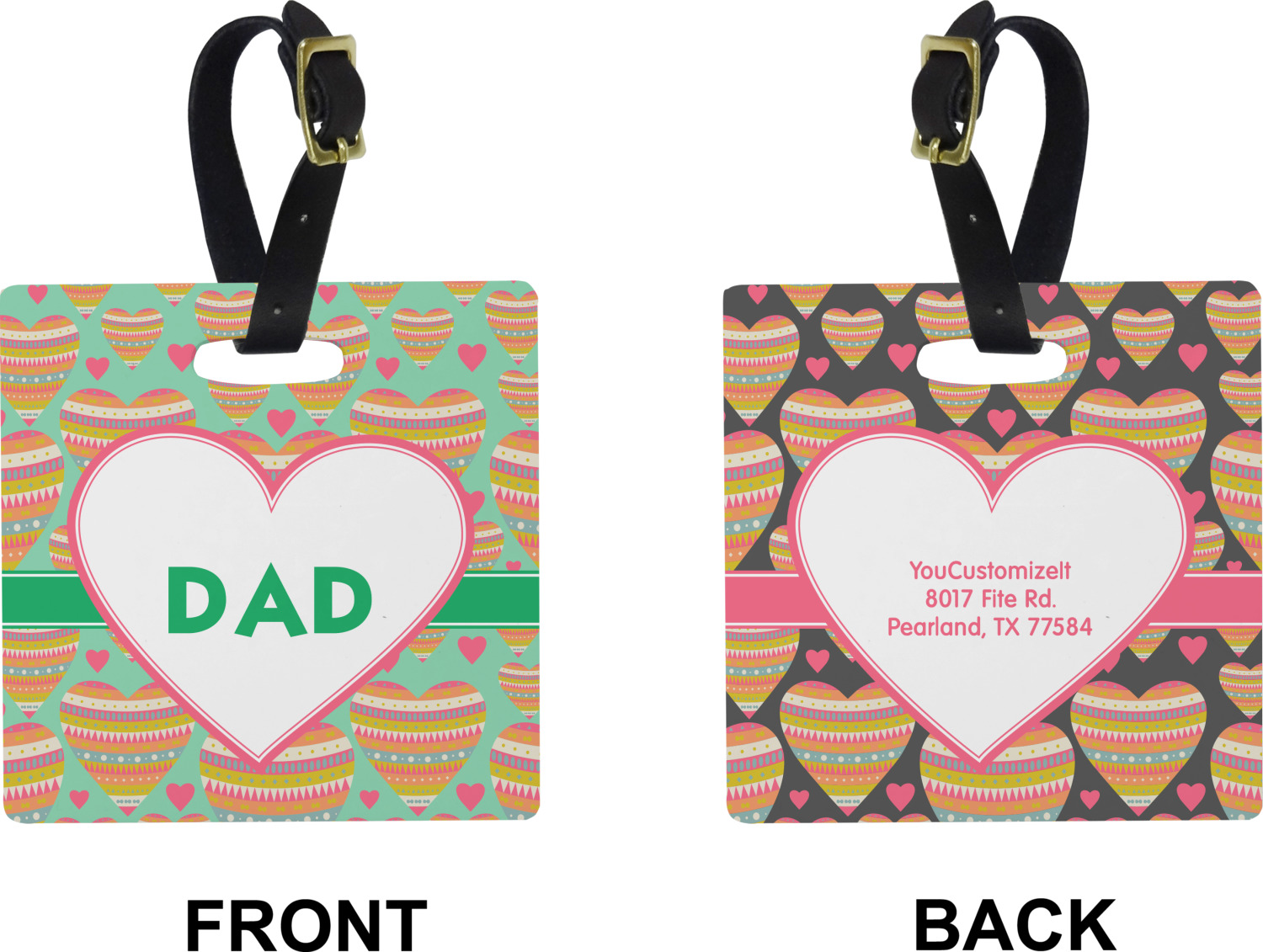 These cute luggage tags are made of a fiber-reinforced, UV-resistant plastic, making them waterproof and durable enough for both everyday use and the rugged adventures of any traveler! A leather strap with holes and a buckle is included with your purchase and can be used to attach your custom luggage tag to any suitcase, backpack, or duffel bag. You can design these travel tags as you wish; your customization will be displayed across the front, while the back will show as little or as much personal information as you want.