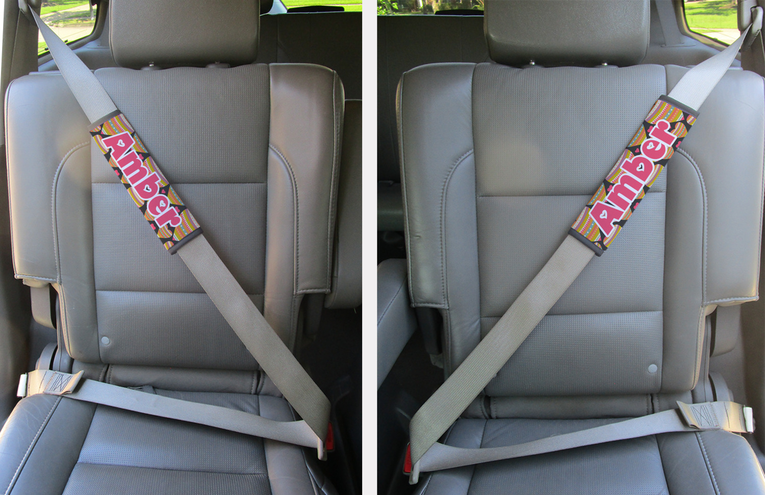 Made from neoprene, our seat belt strap covers wrap around the belt itself and have a Velcro tab for easy attachment and closure. The belt's edges are trimmed with a black polyester for a secure finish. Each cover is 9.5 by 7 inches when open and 9.5 by 2.5 inches when closed. We print your personalized design on the face of the seat belt pad.