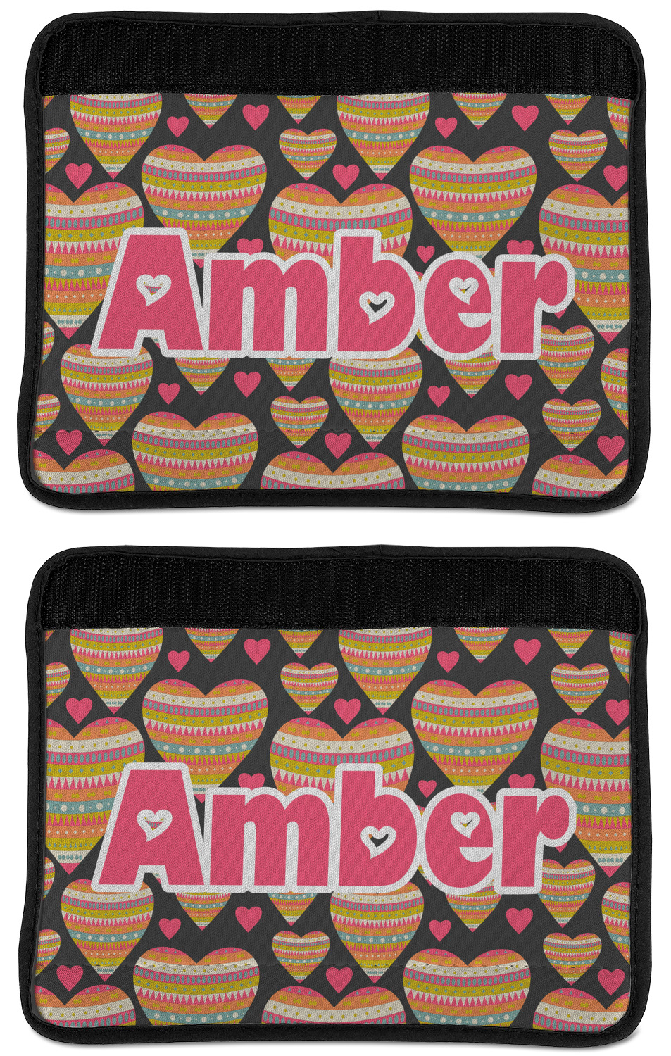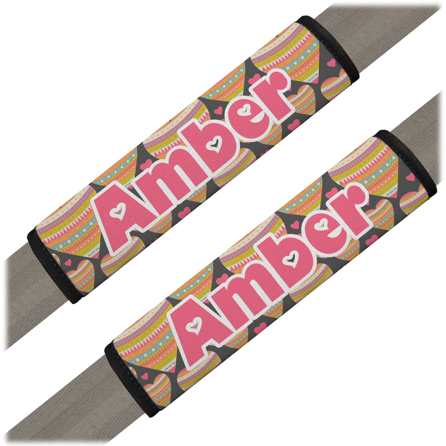 Made from neoprene, our seat belt strap covers wrap around the belt itself and have a Velcro tab for easy attachment and closure. The belt's edges are trimmed with a black polyester for a secure finish. Each cover is 9.5 by 7 inches when open and 9.5 by 2.5 inches when closed. We print your personalized design on the face of the seat belt pad.