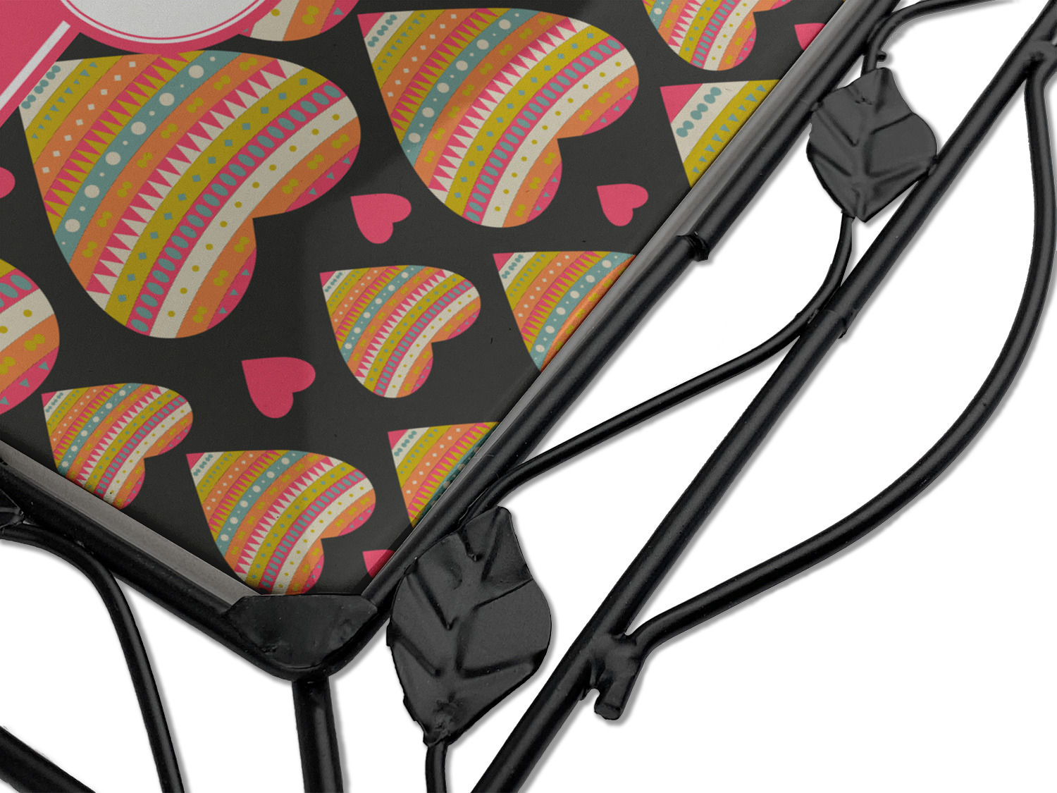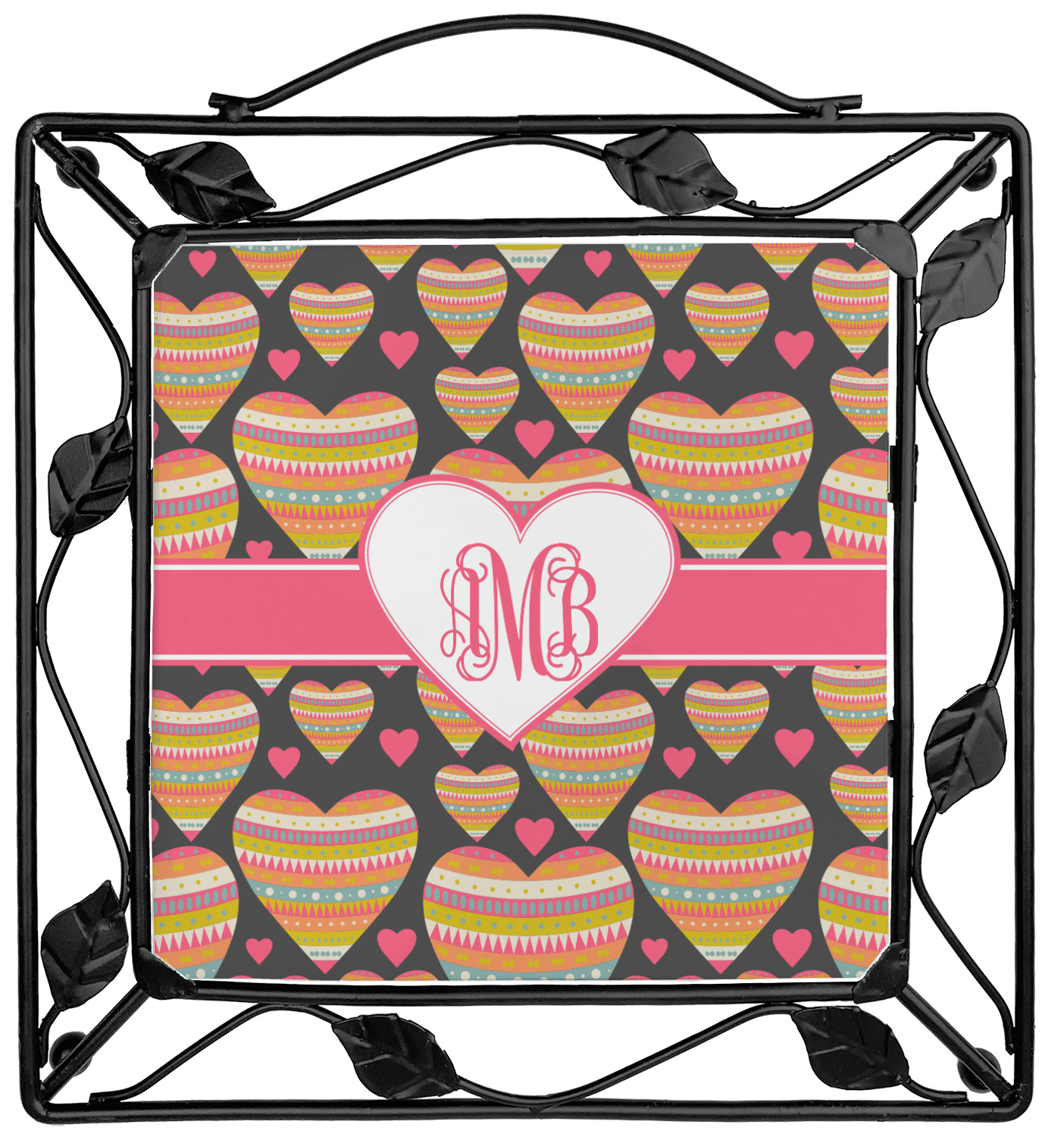 Our square trivets are made from a durable, wrought iron. This model features 4 small half circles, one on each corner, and a larger ring of iron that circles the central, customized tile. Each of the 4 corners has a round foot on its bottom for stability. This trivet is 8.75 by 8.75 inches, but the central tile measures at 6 inches on both sides.