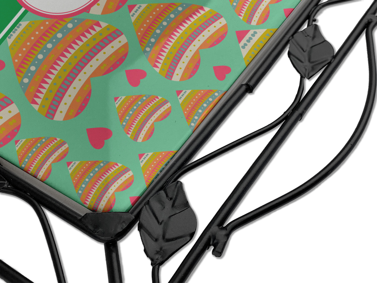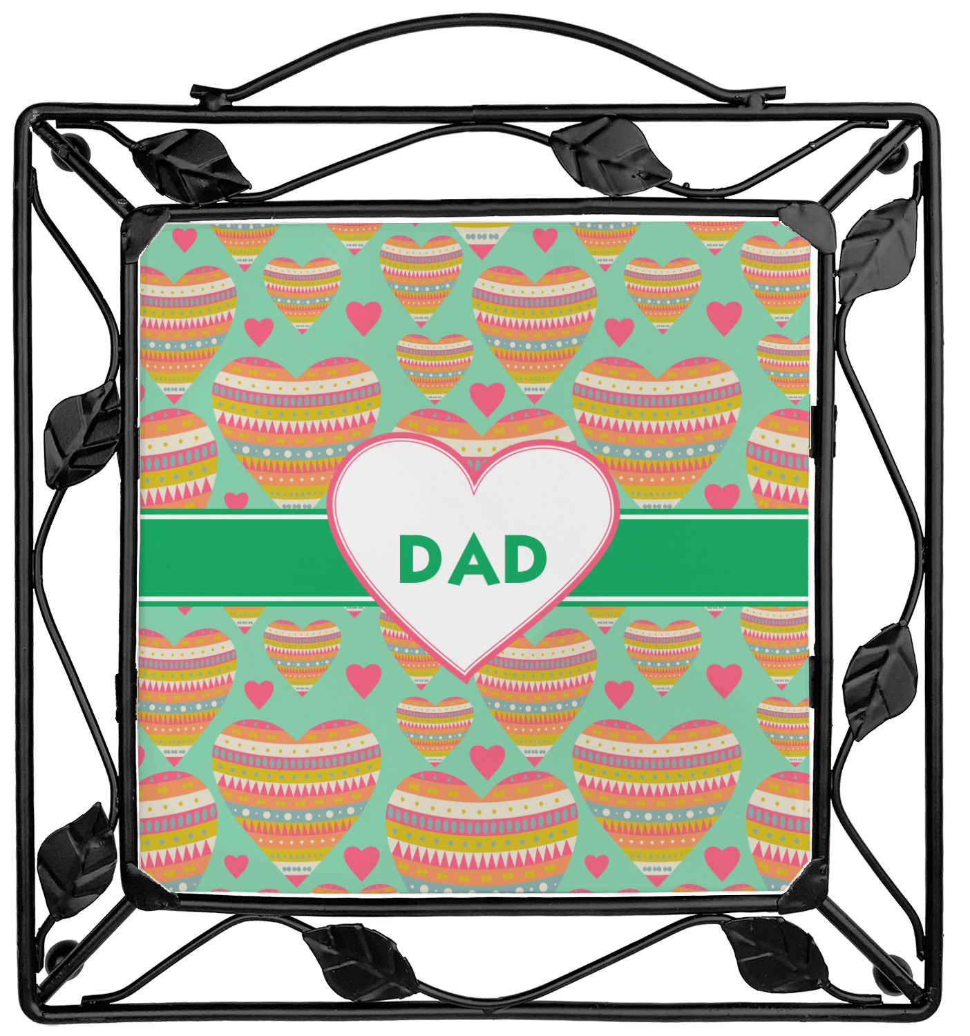 Our square trivets are made from a durable, wrought iron. This model features 4 small half circles, one on each corner, and a larger ring of iron that circles the central, customized tile. Each of the 4 corners has a round foot on its bottom for stability. This trivet is 8.75 by 8.75 inches, but the central tile measures at 6 inches on both sides.