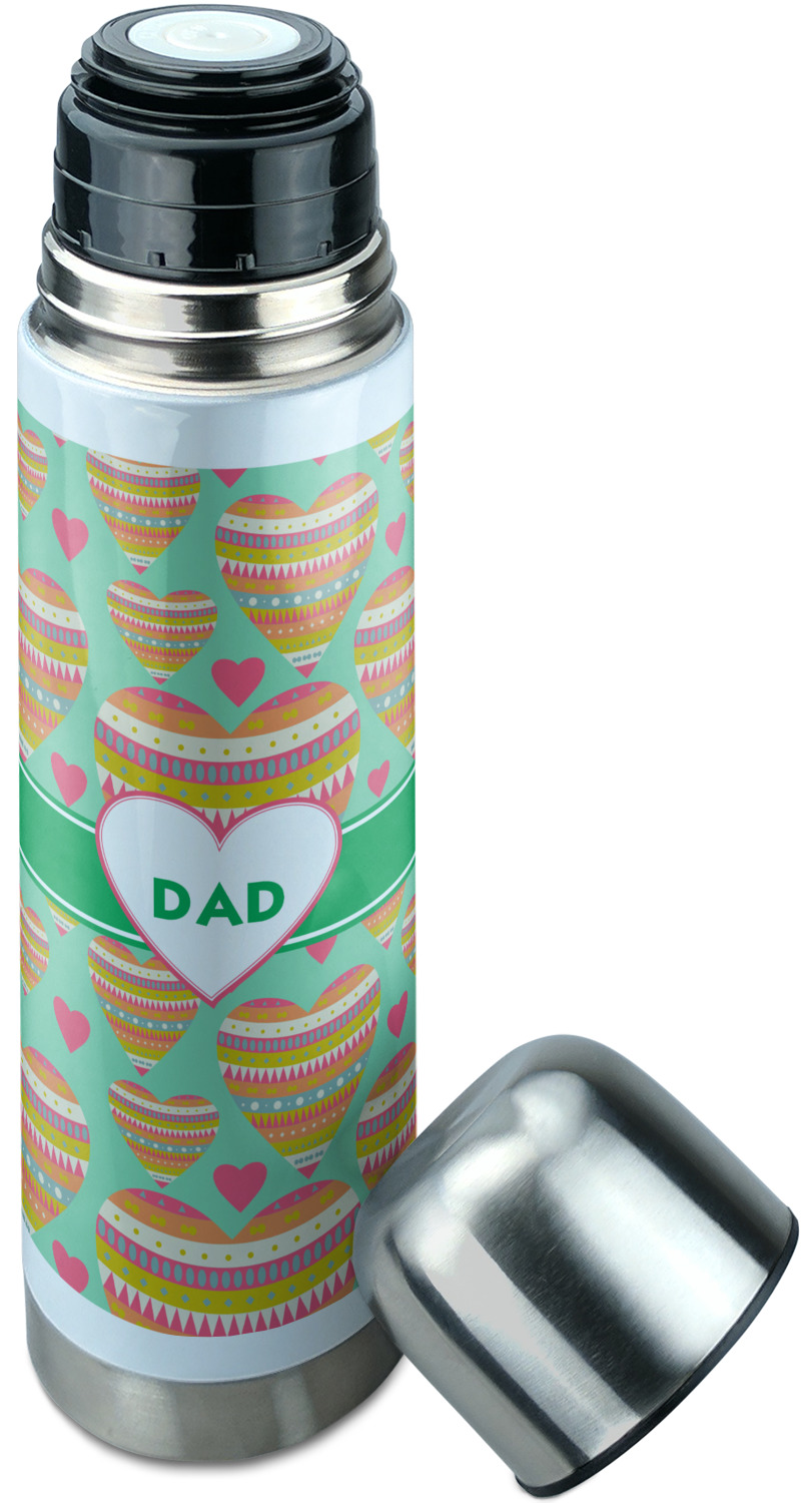 Manufactured from stainless steel, this thermos is built durably and double-walled insulated to preserve the temperature of your drink for hours. It also features a screw off lid that is made to also function as a small cup. Upon unscrewing this part of the thermos bottle, a pop-open, pour feature emerges. This feature allows you to slowly pour your beverage into your lid, ensuring a steady, controlled pour into your lid or other cup. With a capacity of 25 ounces, these large thermoses can hold several servings of your favorite beverage. Your customization is displayed all around the bottle with bright, vibrant color.