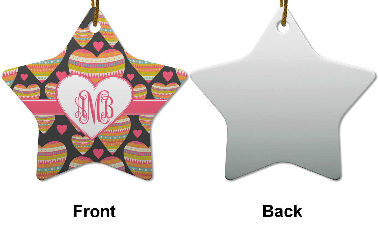 Have a happy holiday and share the joy of Christmas with your loved ones by hanging up personalized ceramic ornaments! Ornaments add a touch of who you are and the things you love onto the Christmas tree! Create custom ornaments for the kids and have them hang up their own star with their name, or pay remembrance this holiday to missed loved ones with our ceramic heart ornament. Browse many of our unique designs and customize them the way you'd like! From monograms, logos, and patterns, we have it all! You can even upload a photo of your family for us to print onto the ornament! The possibilities are endless!