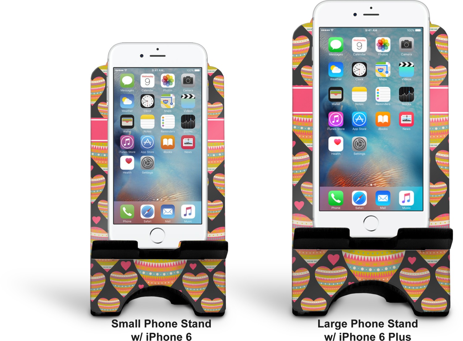 To meet your needs, we offer four variations of this IPhone stand. The backboard of the first version is shaped as a plain, yet sleek rectangle, and is available in two sizes. Our smaller size is approximately 4 by 3.25 by 7 inches, while the larger model is 4 by 3.77 by 8.5 inches. Alongside this model, we also provide you with a more decorative option. The upper part of our second version features a curved edge, for a classy, suave appearance. This phone holder is also sold in two sizes: a smaller version, which is 4 by 3.25 by 7 inches, and our larger model, which is 4 by 3.77 by 8.5 inches. Both models will support large phones, but the larger model is better if you wish to proudly display your personalized design.