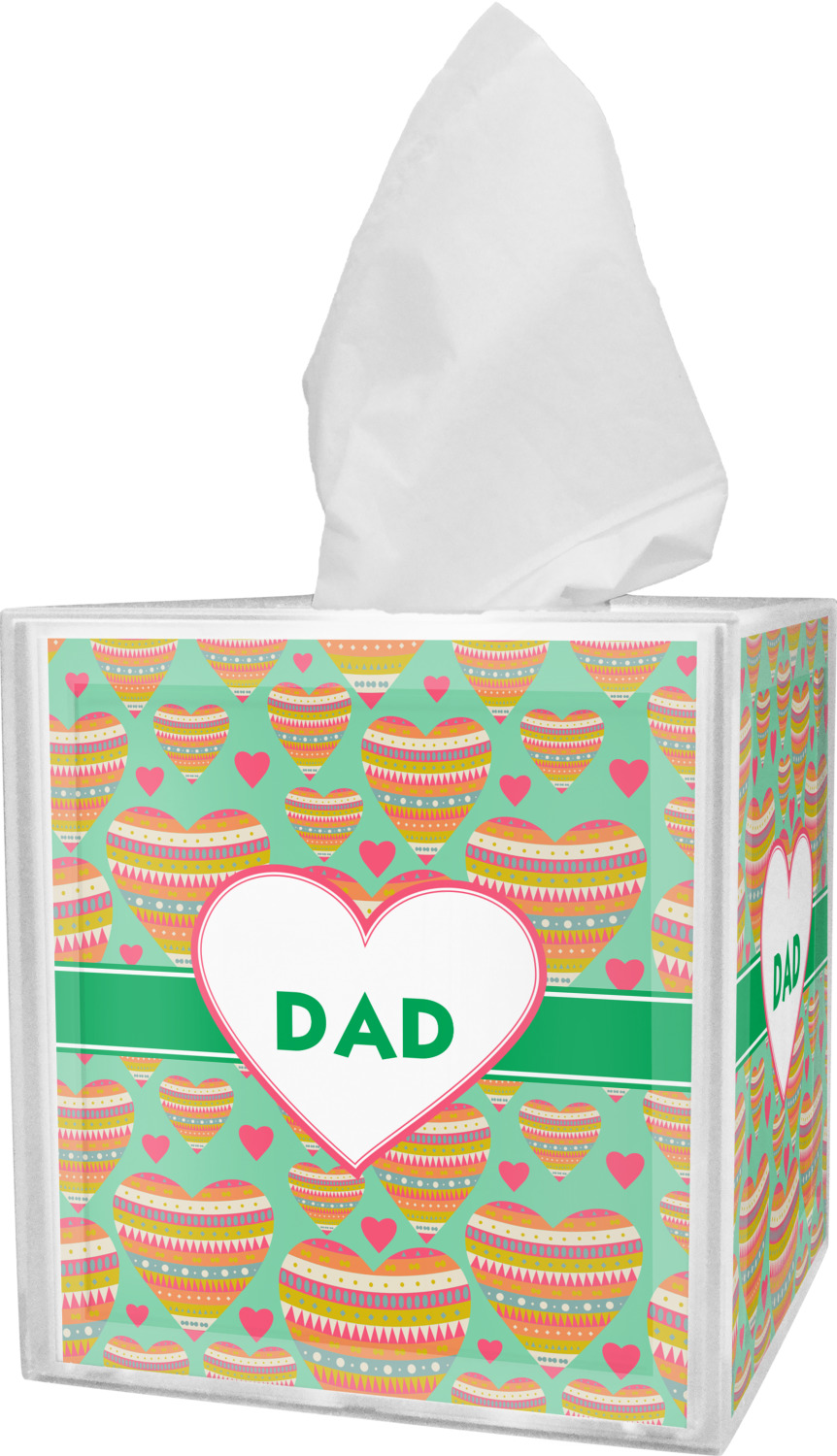 These tissue holders are built from durable acrylic and display your unique personalization on fine-quality vinyl inserts placed within the four sides and top. The box features two pieces, allowing you to easily switch out tissue boxes. On the sides, youll find ridges that ensure the top and base fit securely in place. The bottom of these tissue box holders has four, rubber, non-slip pads to prevent the box from scuffing any surface you decide to display it on. Each box can fit a standard 5 by 5-inch box of tissues.