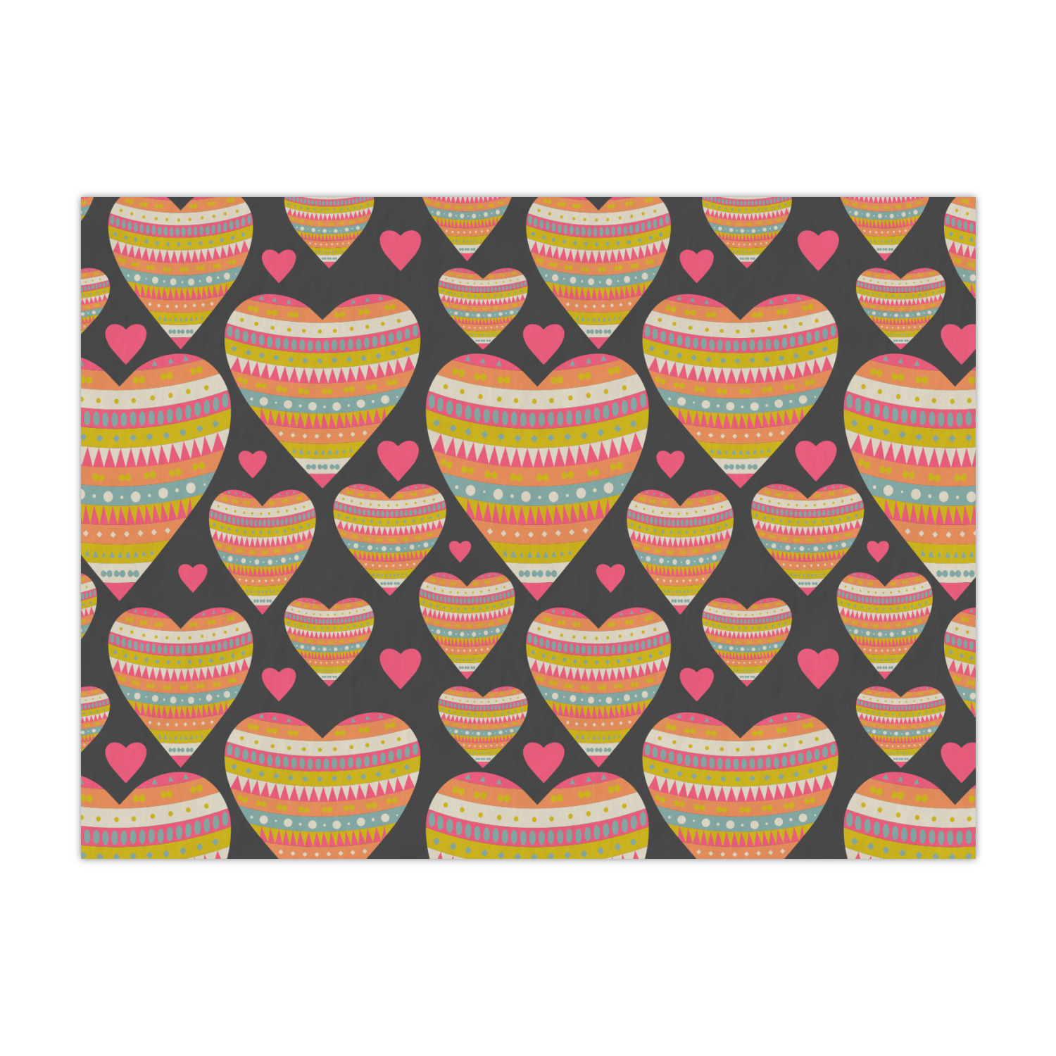 This Valentine's Day design looks sweet enough to eat. Multicolored hearts, each one filled with stripes and triangles and patterns of all kinds, are set on a crisp white background.